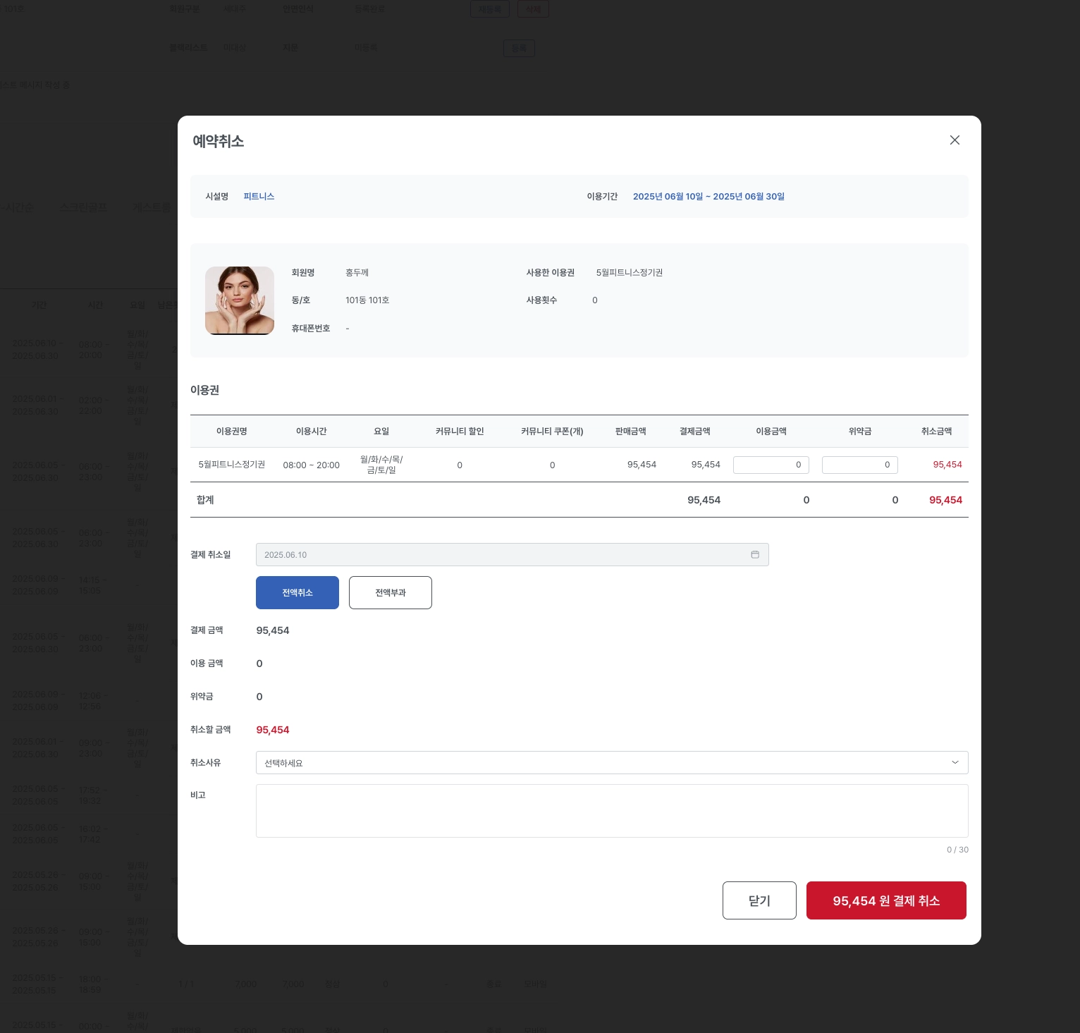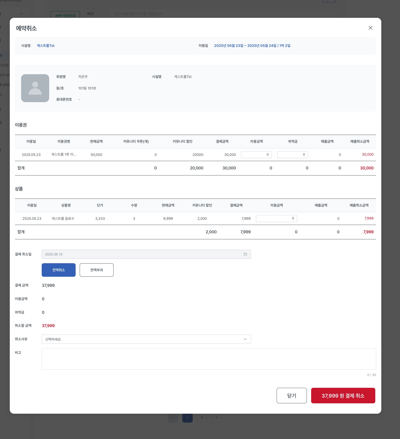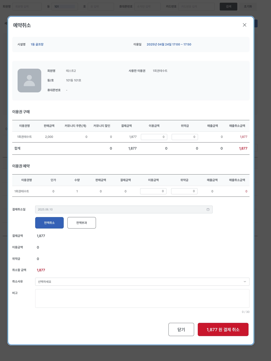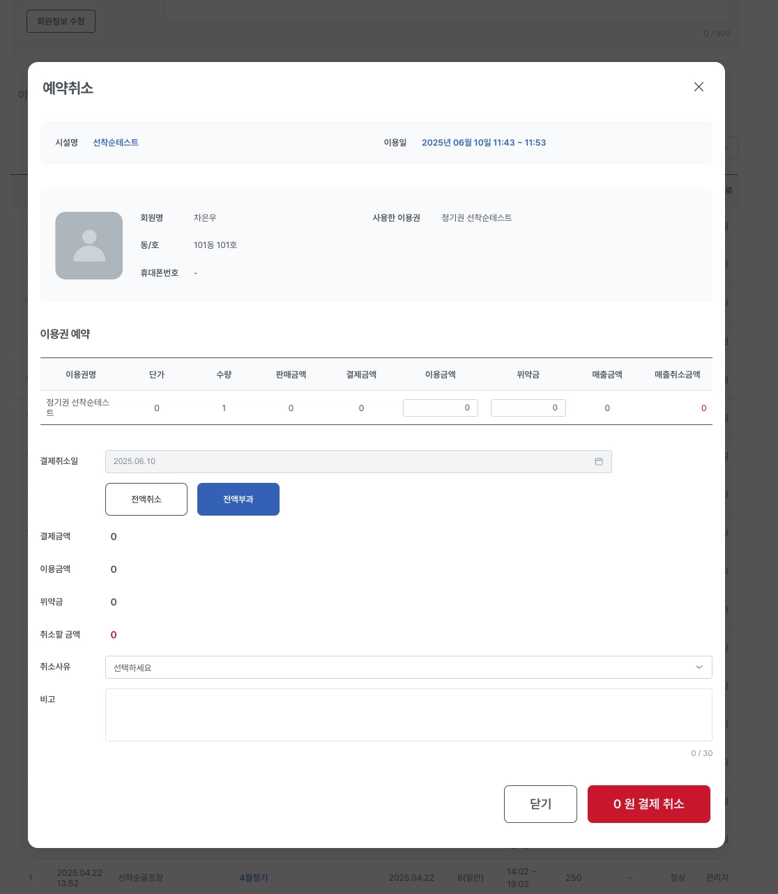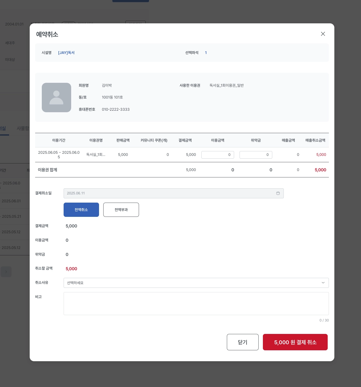 결제상세에서 이용금액, 위약금을 입력하면 해당 금액만큼 차감된 금액이 취소금액으로 반영됩니다.