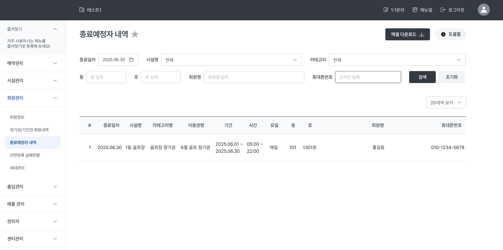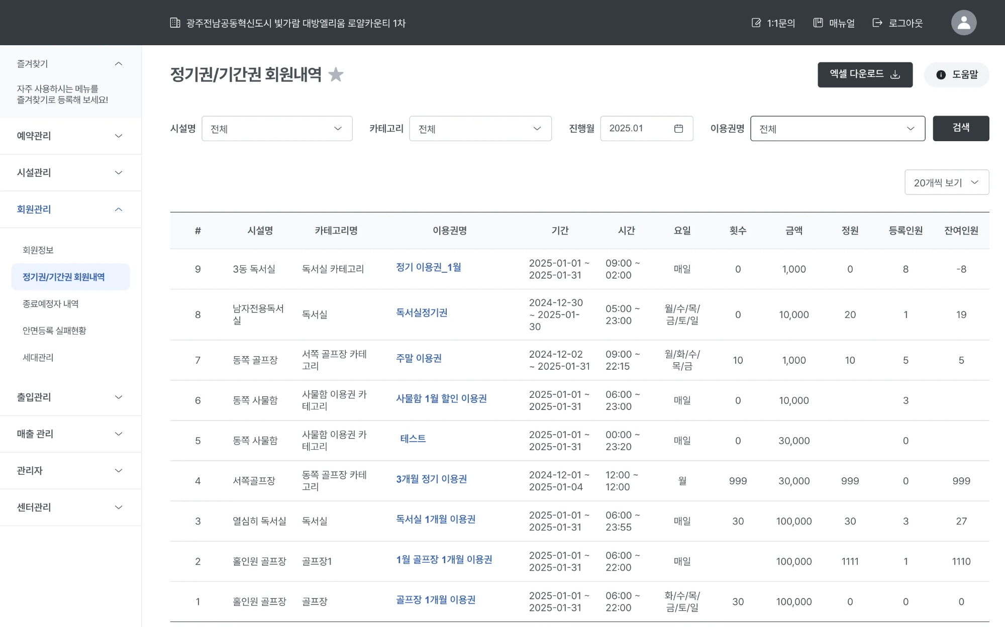 정기권이나 기간권을 구매한 회원 리스트를 엑셀로 다운받을 때 사용됩니다.