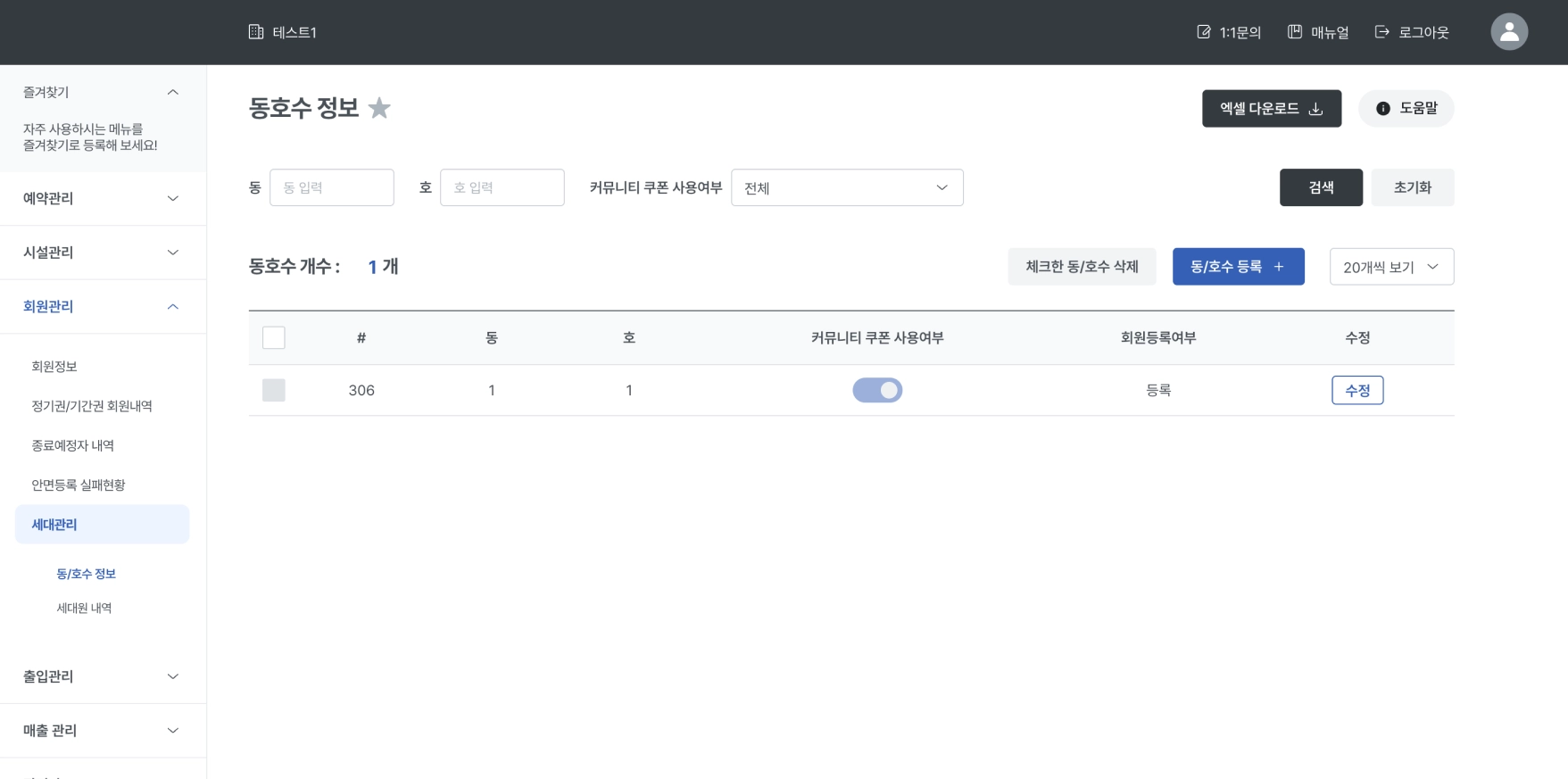 동/호수를 등록하고 관리할 수 있는 화면입니다.