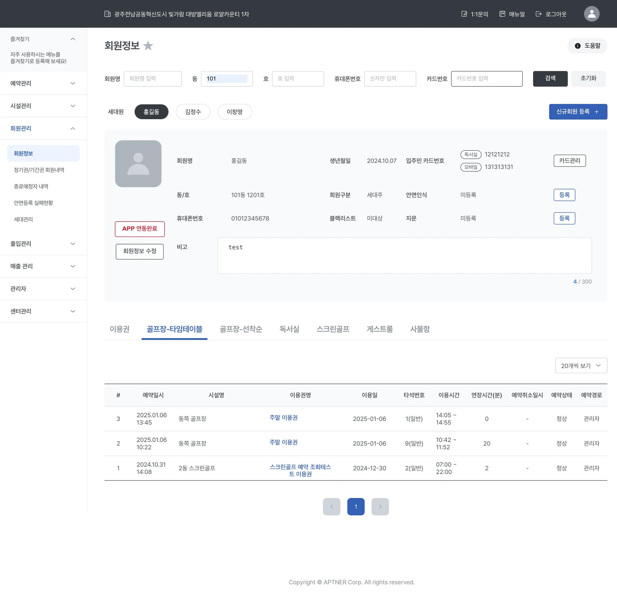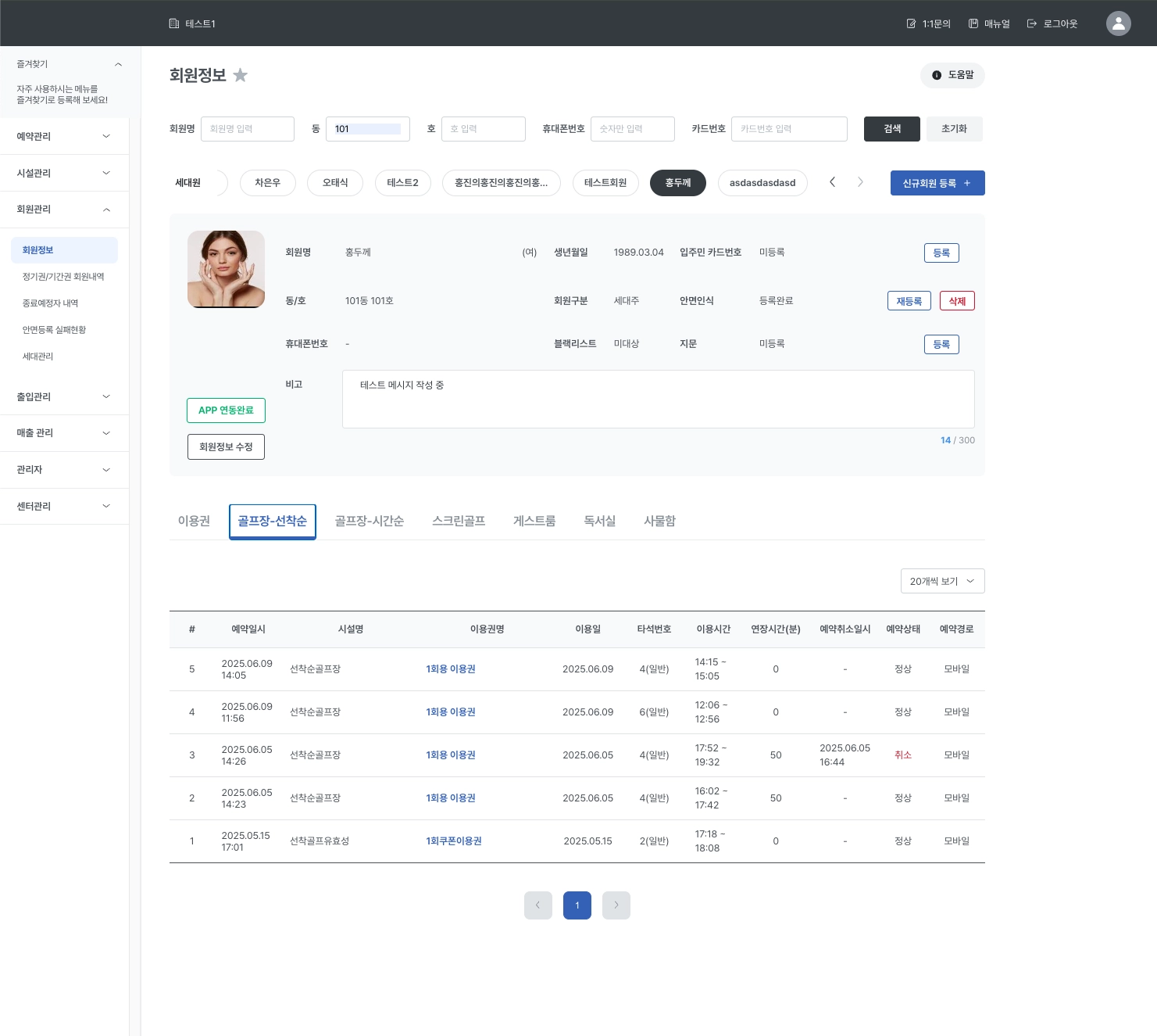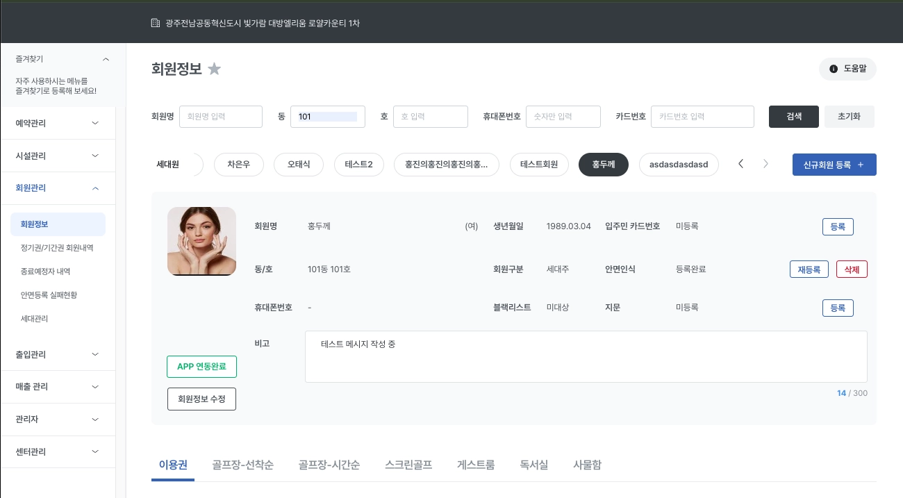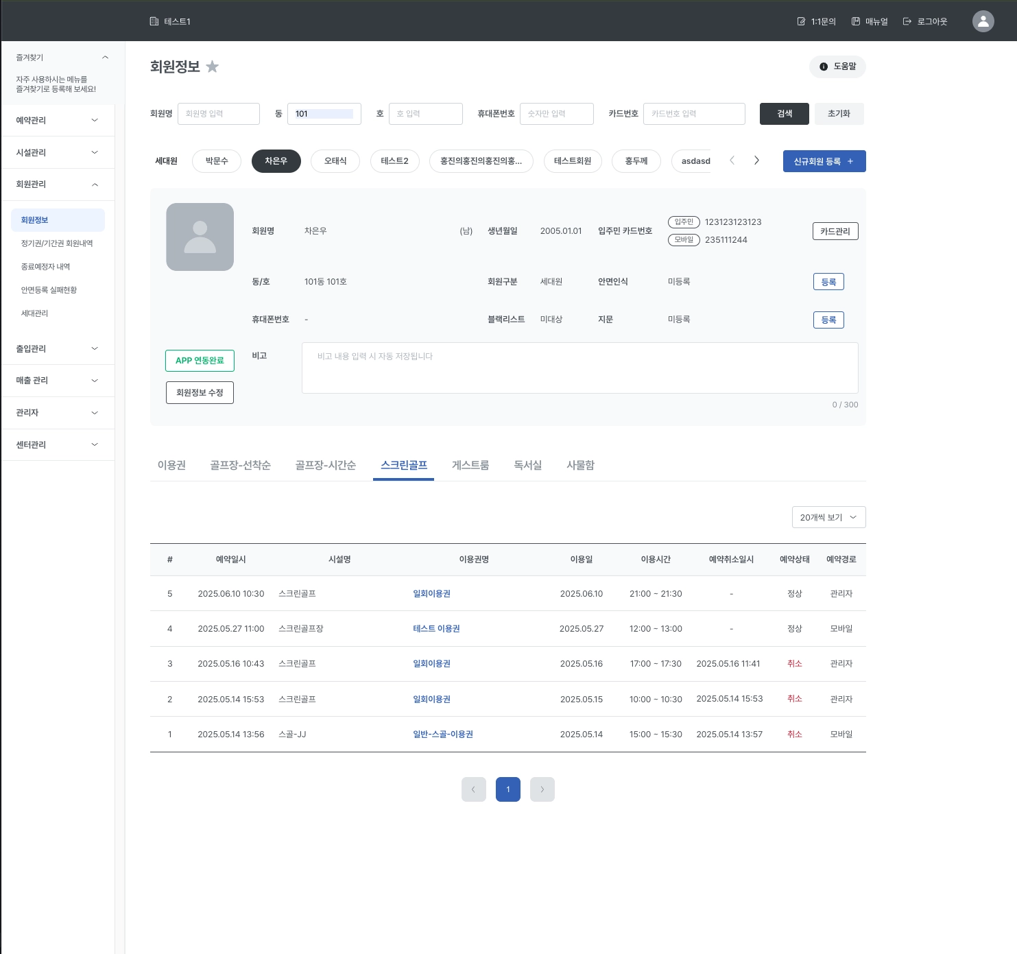 스크린골프 / 게스트룸 탭에서는 회원의 스크린골프 / 게스트룸 예약내역을 확인할 수 있습니다.