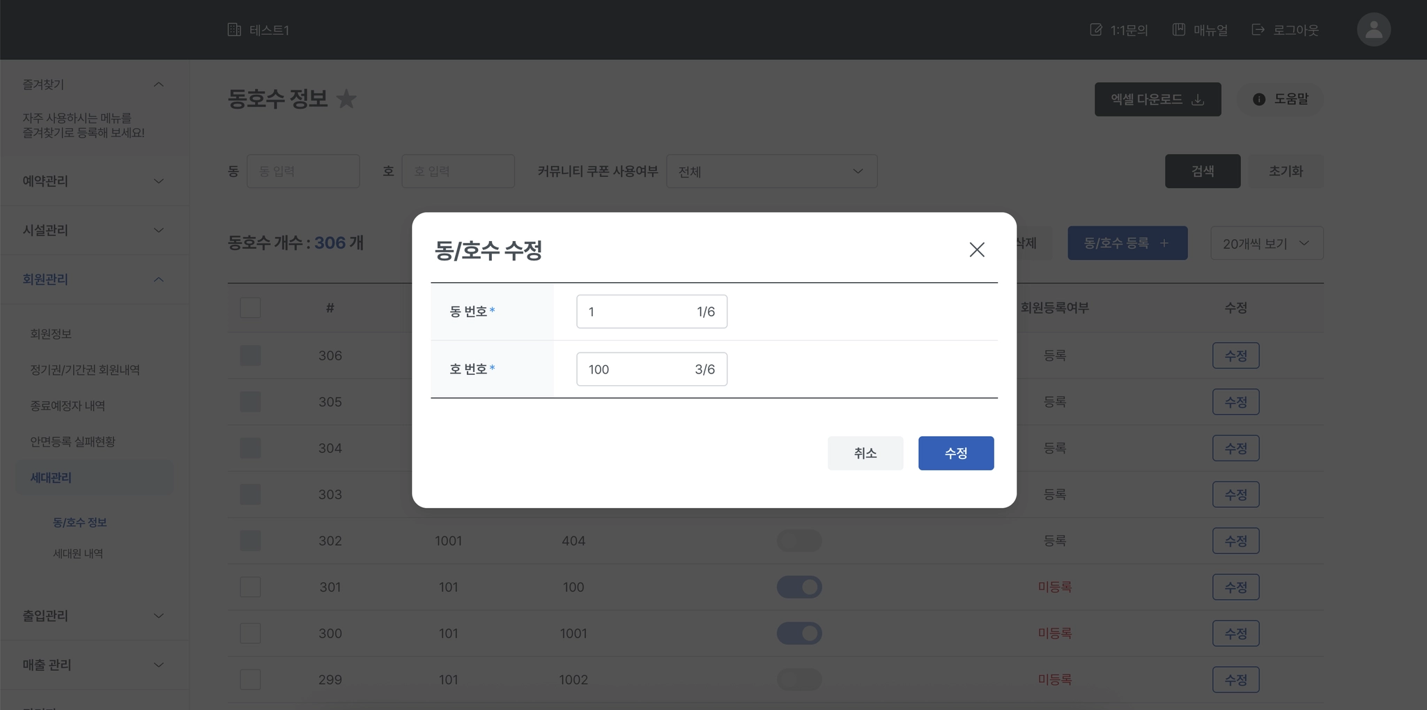 [수정] 버튼 클릭 시, 수정하려는 동/호수의 변경 창이 표시됩니다.