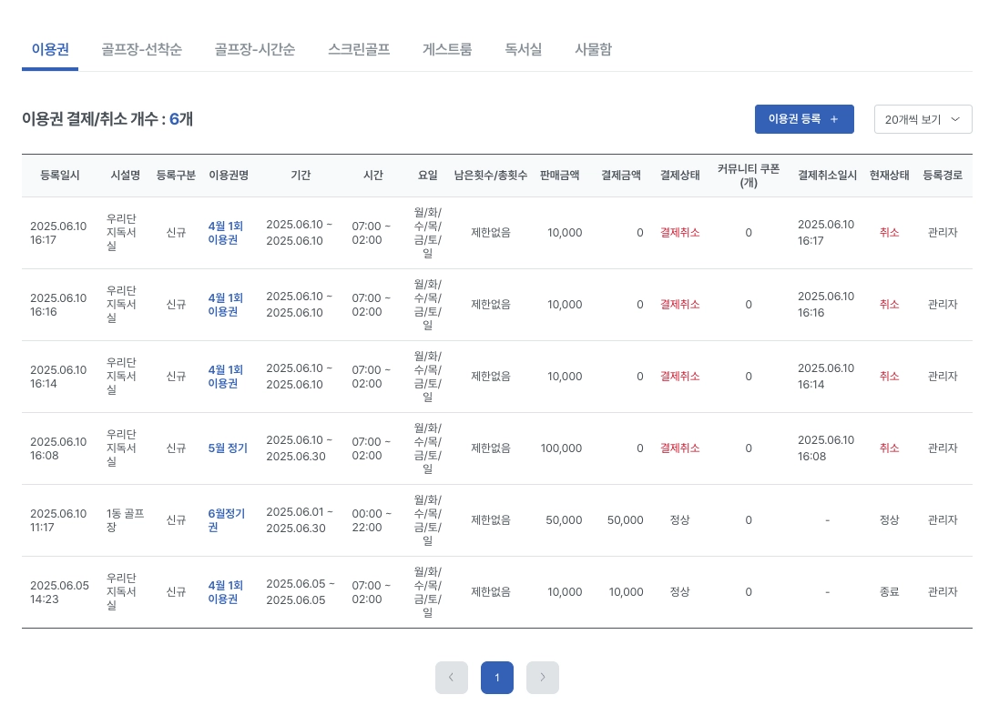스크린골프 / 게스트룸의 경우 정기권 / 기간권이 없는 1회 이용권으로 이용이 가능하기에 이용권을 결제 취소하게 됩니다.