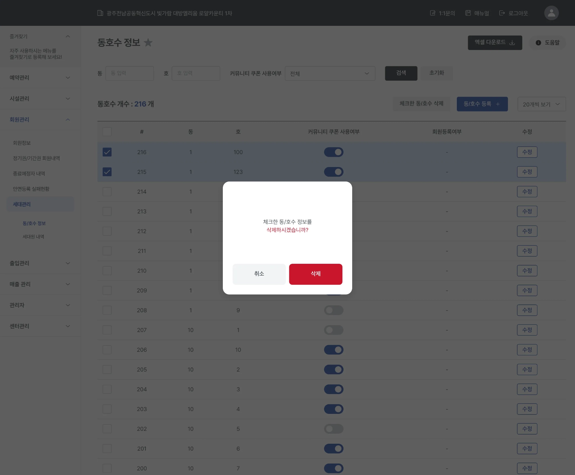 동/호수 정보의 체크박스를 체크한 뒤 [체크한 동/호수 삭제] 버튼 클릭 시 삭제 확인 팝업이 표시됩니다.
