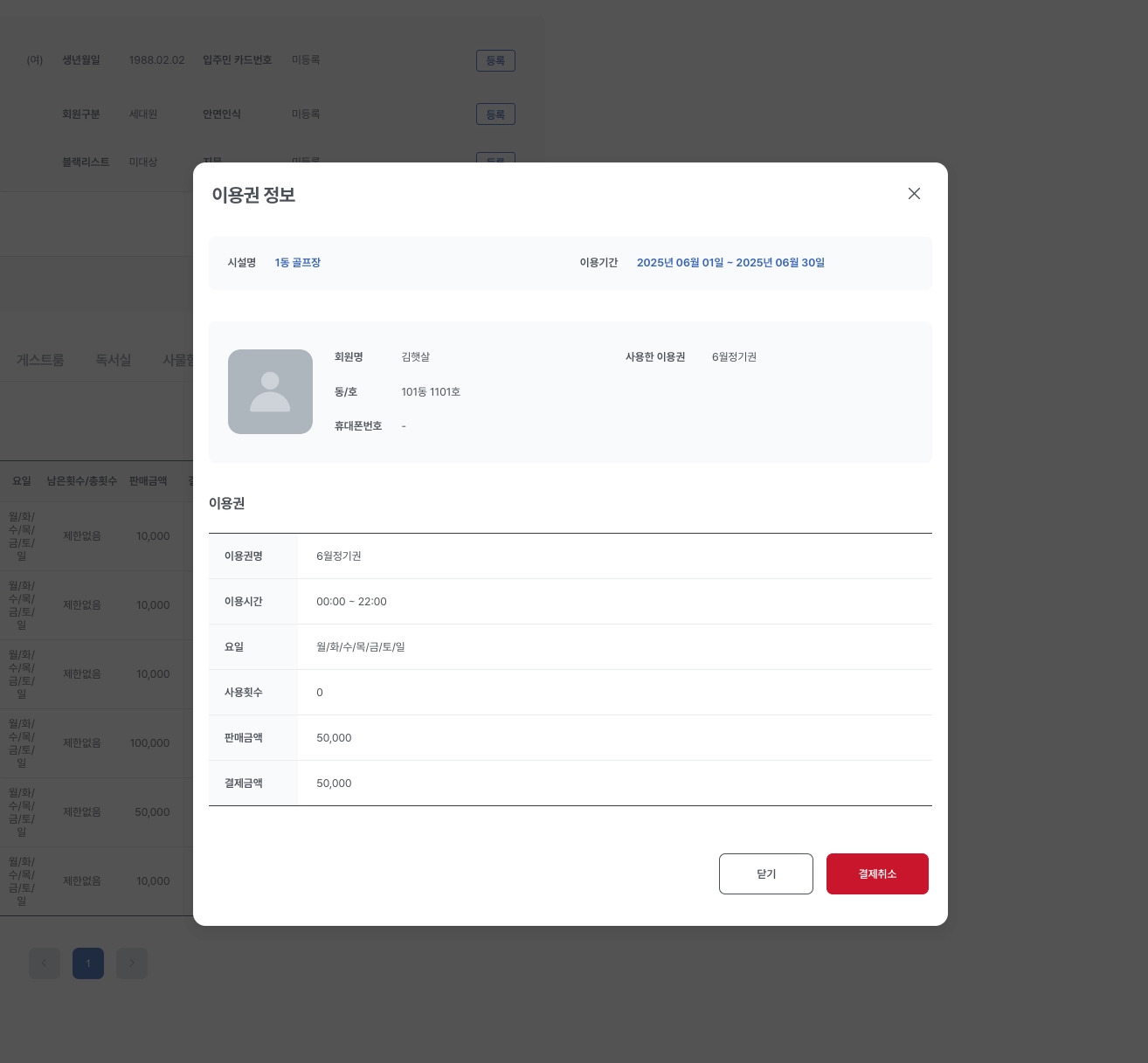 조회한 회원이 구매한 이용권 내역을 확인할 수 있습니다.