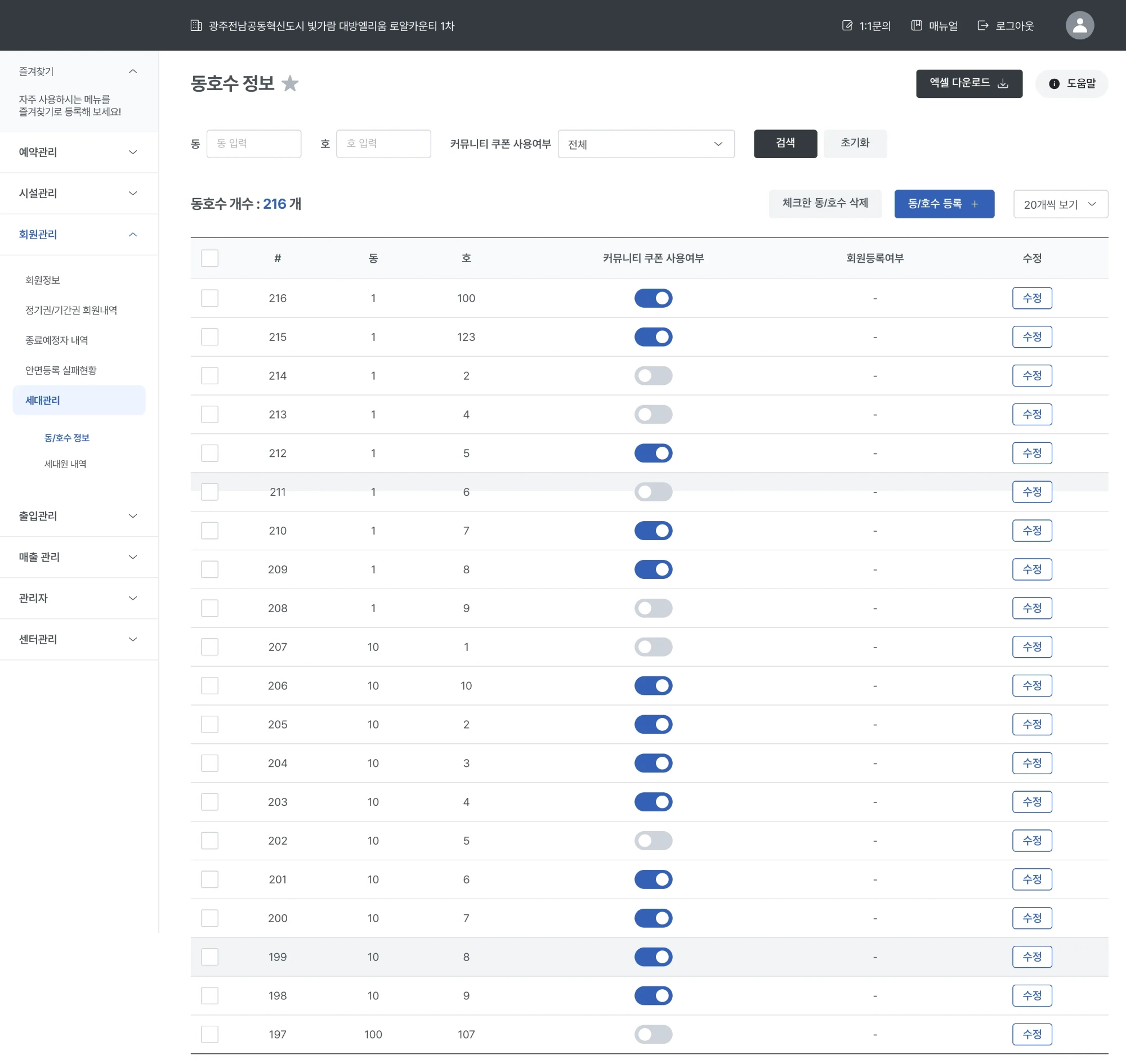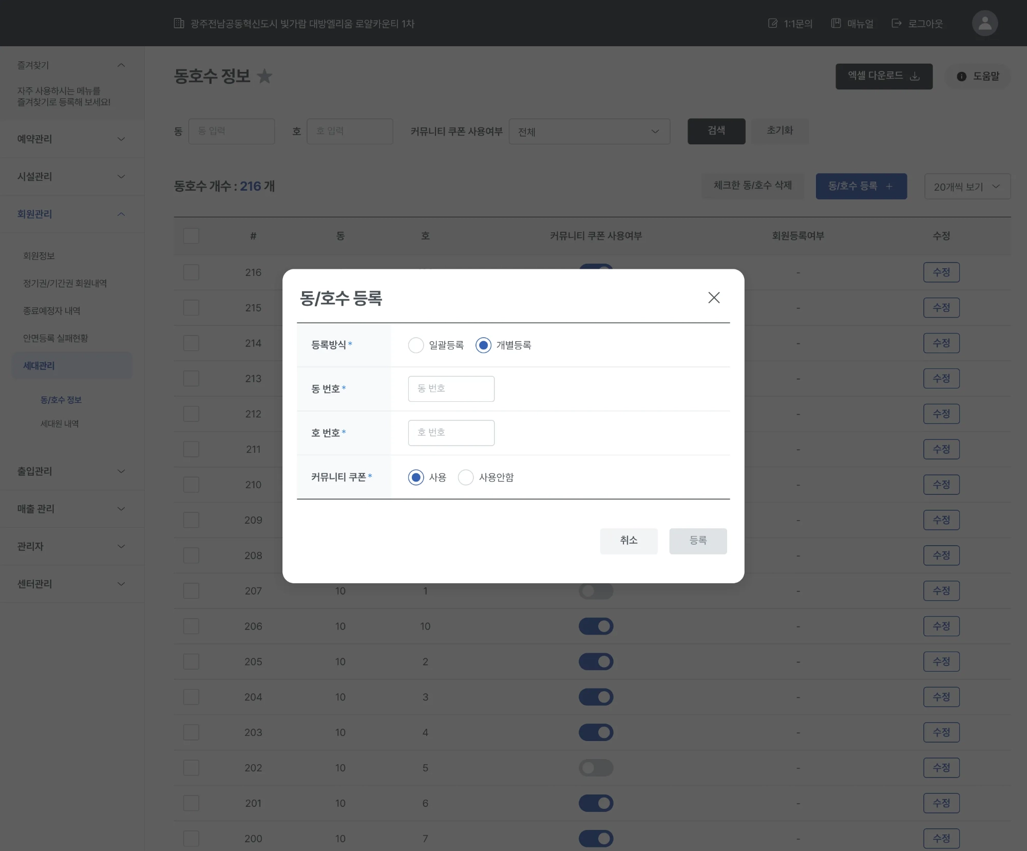 단지의 동 및 호수를 일괄 등록 또는 개별 등록이 가능합니다.
