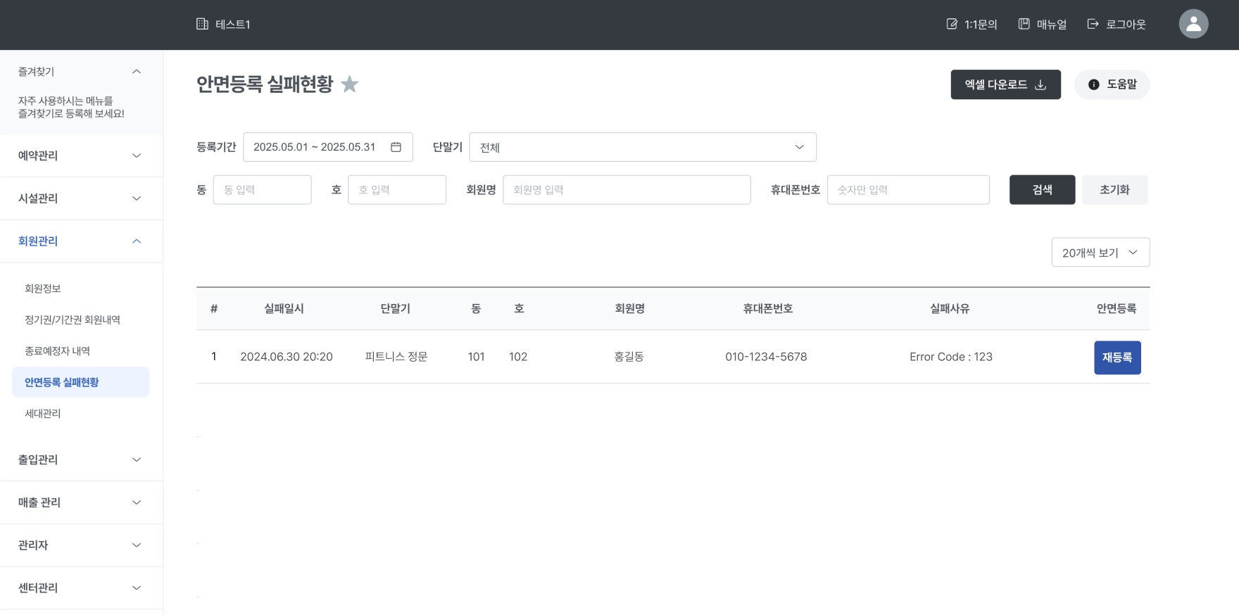 게이트 출입 시 필요한 안면인식 정보 등록에 실패한 회원들의 정보를 확인할 수 있으며, 필요한 경우 안면 정보를 다시 등록할 수 있습니다.