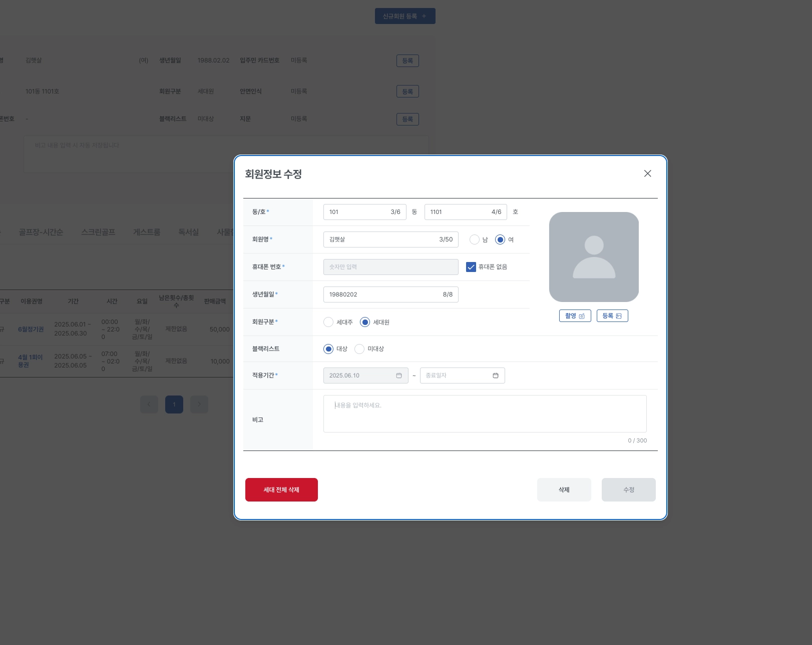 [세대 전체 삭제]버튼 클릭시 같은 동/호수에 등록된 회원이 모두 삭제됩니다.