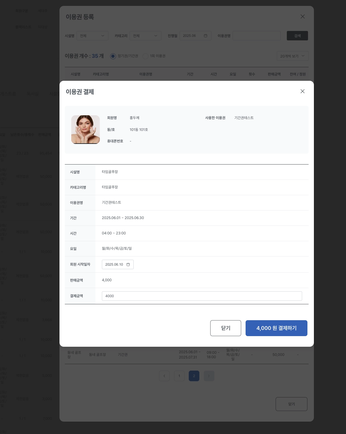 리스트 상의 이용권명 클릭시 해당 이용권의 상세내역과 등록한 회원정보를 확인할 수 있습니다.