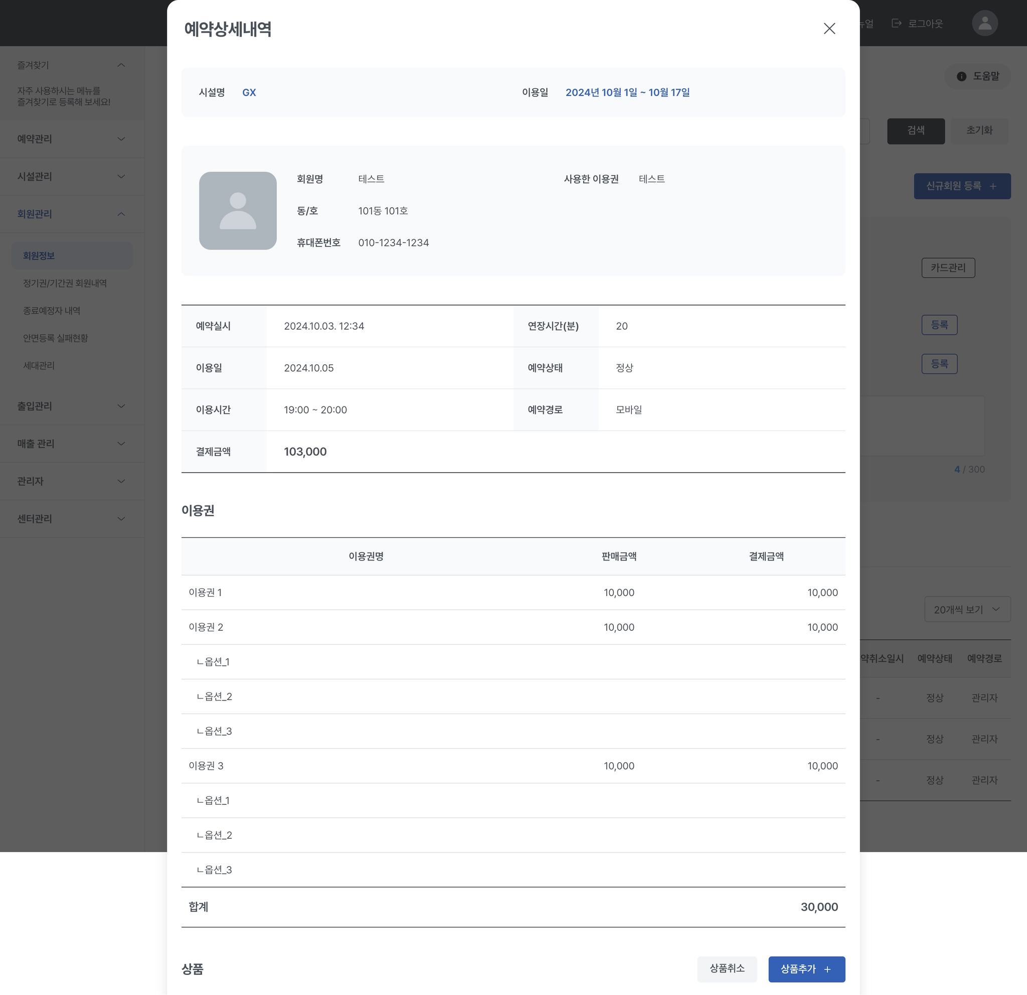 예약내역에서 [상품추가]버튼 클릭시 상품추가 팝업이 표시됩니다.