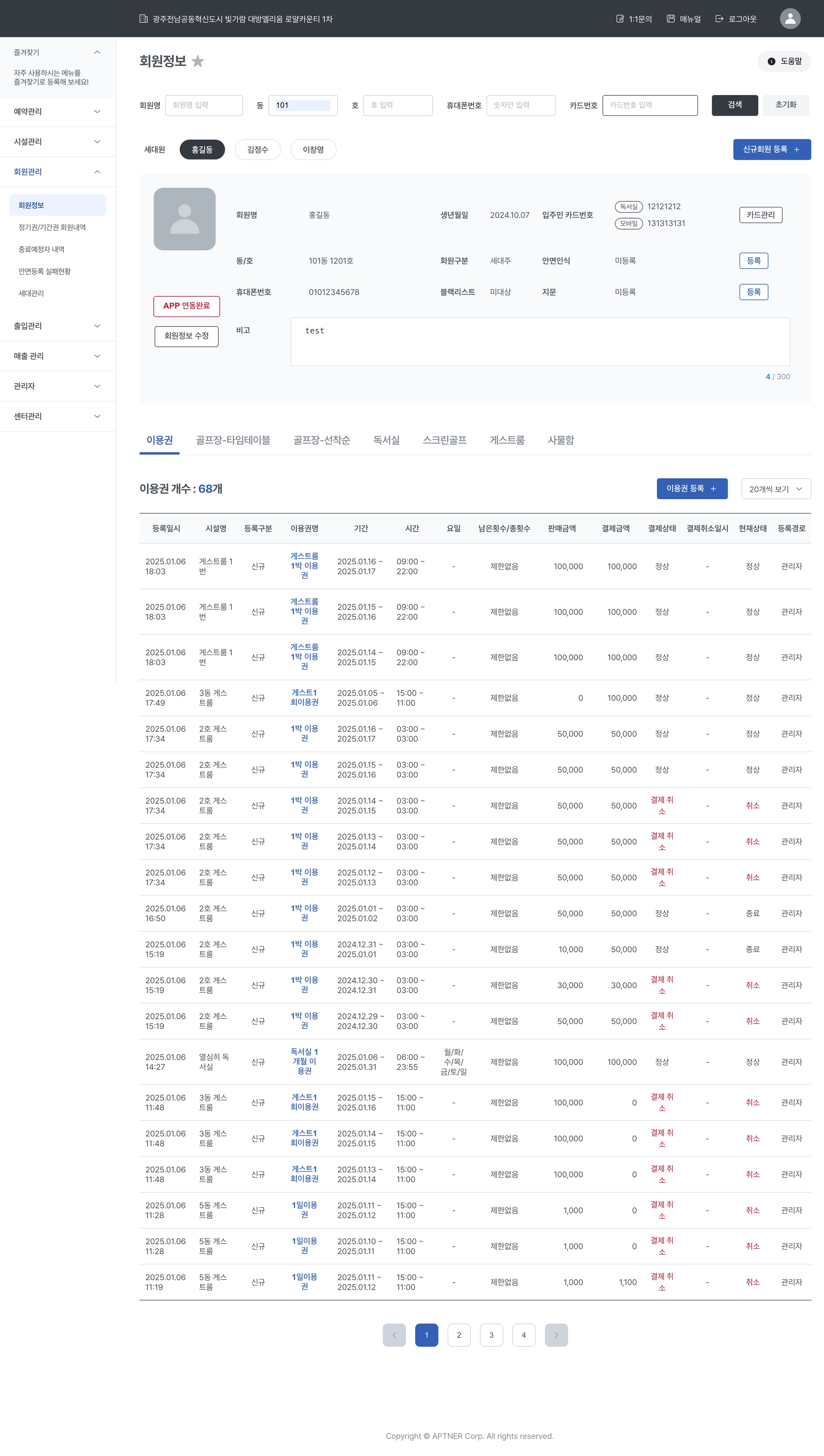 정기권이나 기간권을 결제한 회원내역을 확인할 수 있습니다.