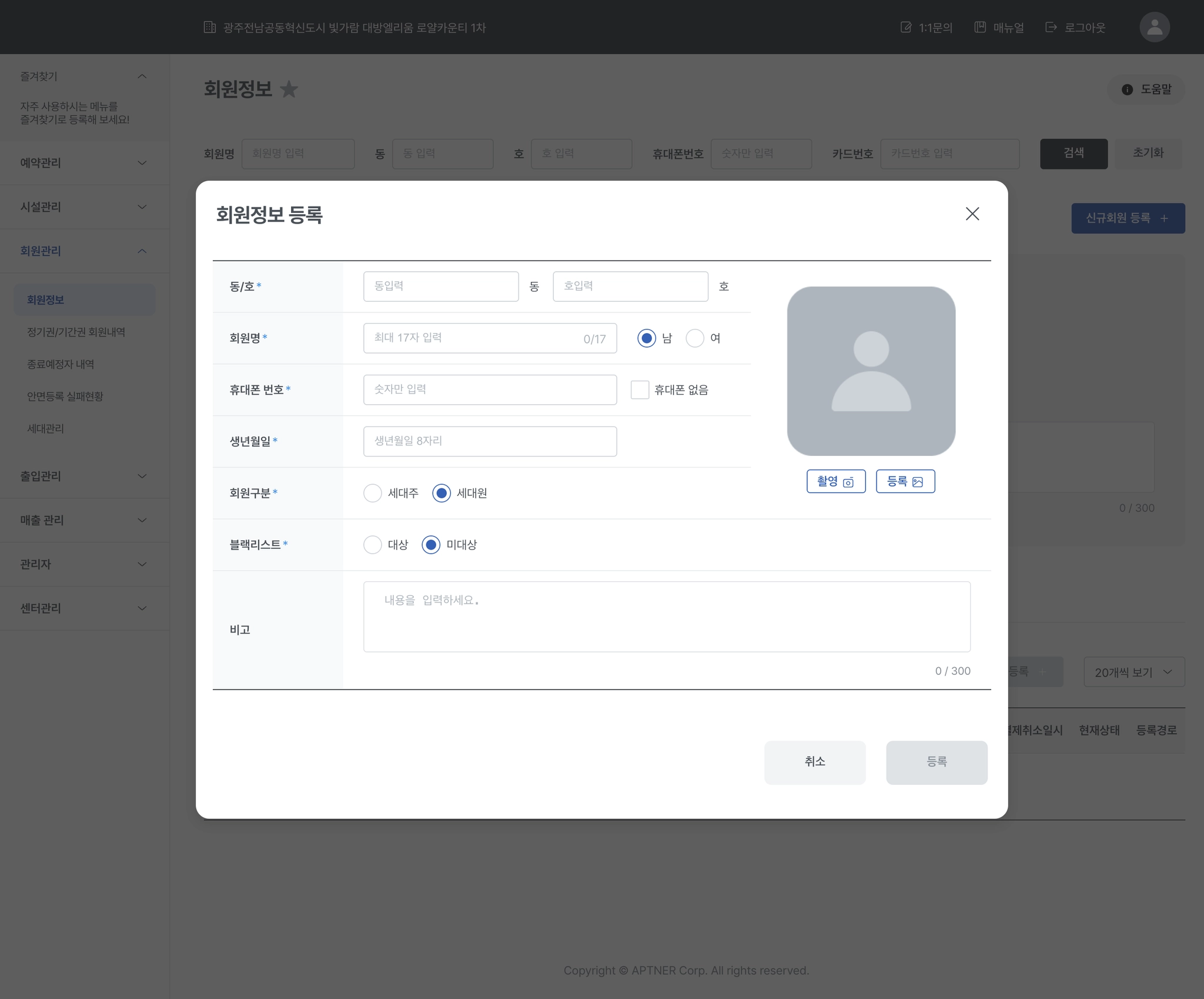 안면등록기 연동이 필요하며, 회원 촬영은 안면등록기로 촬영하여 등록 할 수 있습니다.