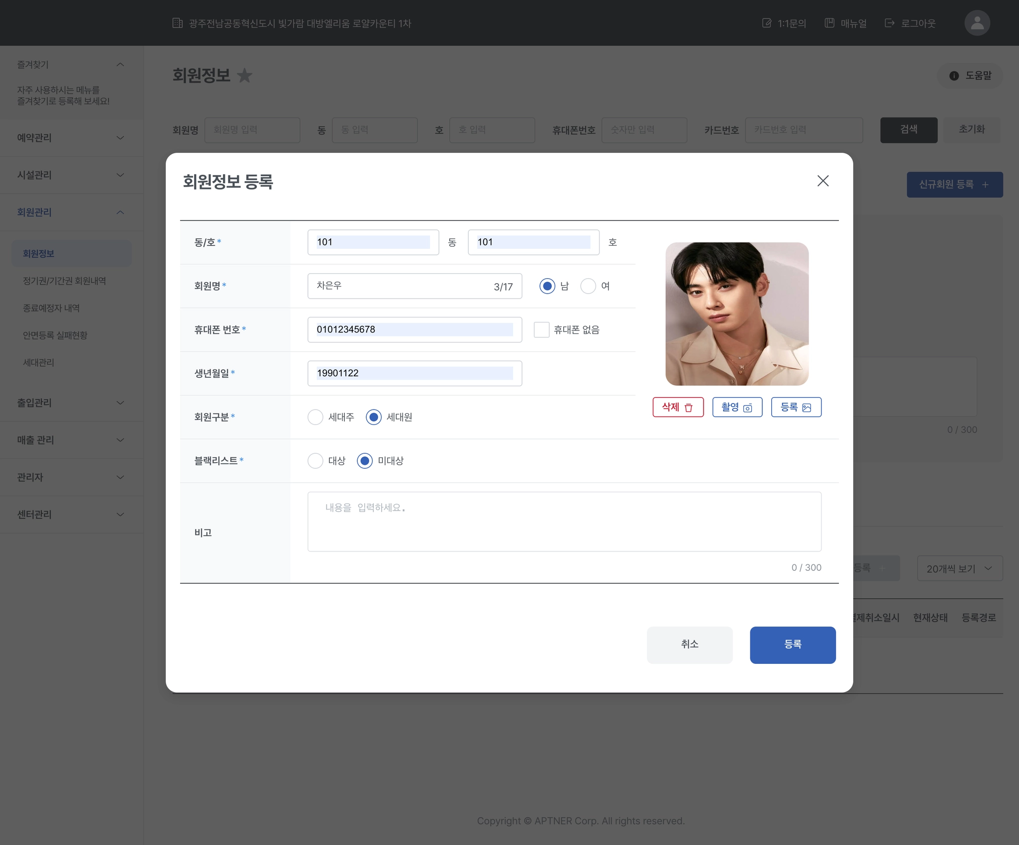 입주민 카드번호, 안면인식 정보, 지문등은 신규로 등록하거나 재등록 할 수 있습니다.