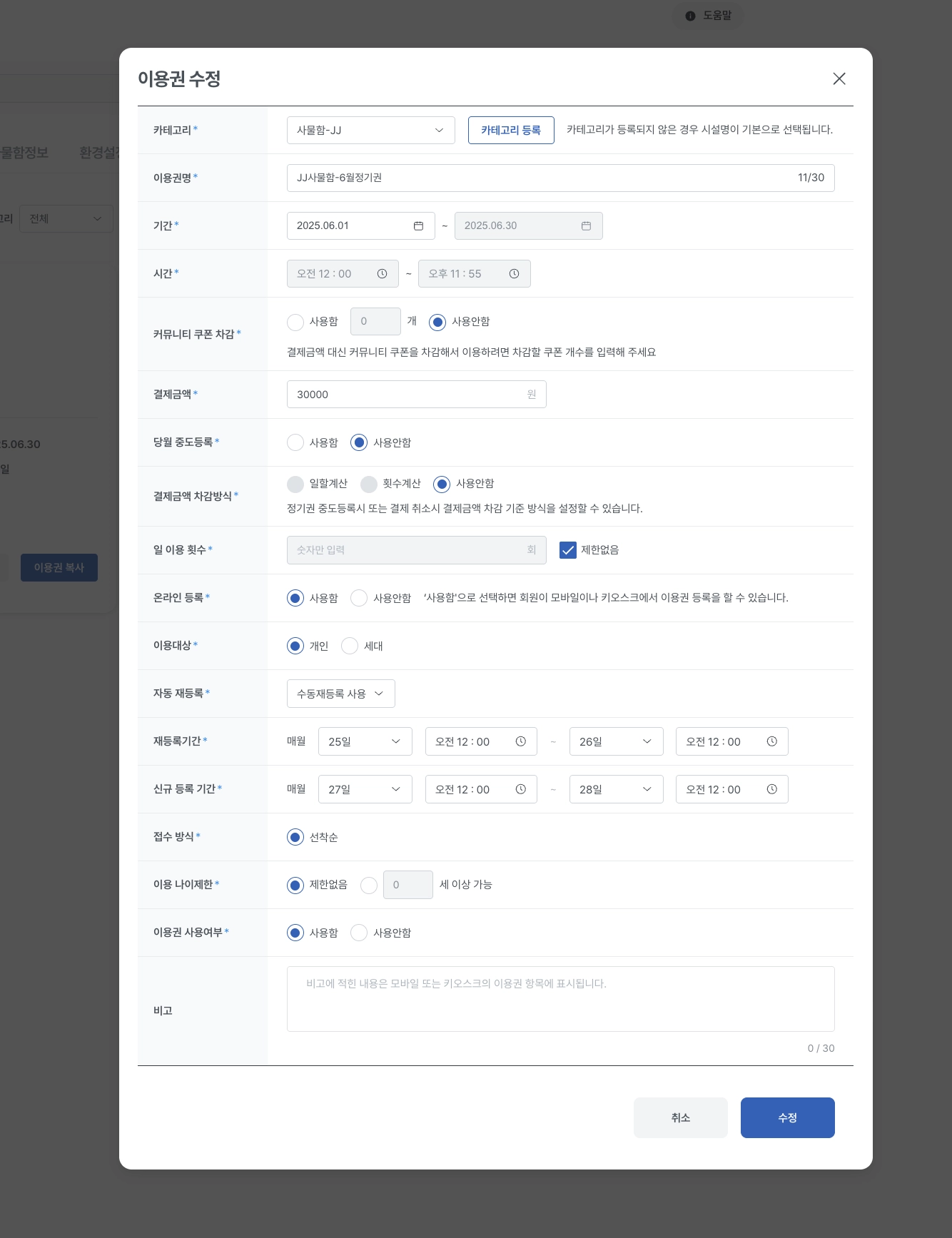 이용권 타입이 정기권인 경우에만 설정 가능하며, 자동재등록과 수동재등록으로 이용권 구매를 할 수 없으며, 이용권 기간 이전달의 신규등록기간동안 입주민 이용권 구매를 할 수 있습니다.