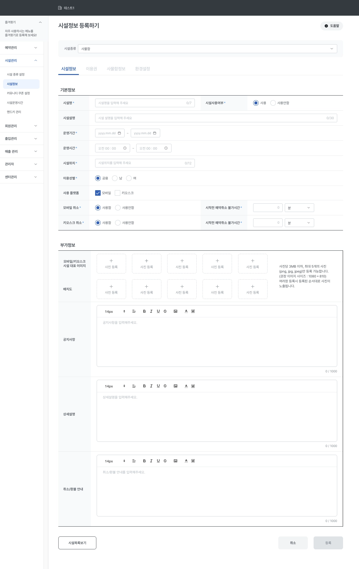 카테고리는 기본적으로 시설명이 카테고리에 등록되어 있으며 추가 카테고리 생성 필요시 [카테고리 등록] 버튼 클릭시 카테고리를 등록할 수 있습니다.