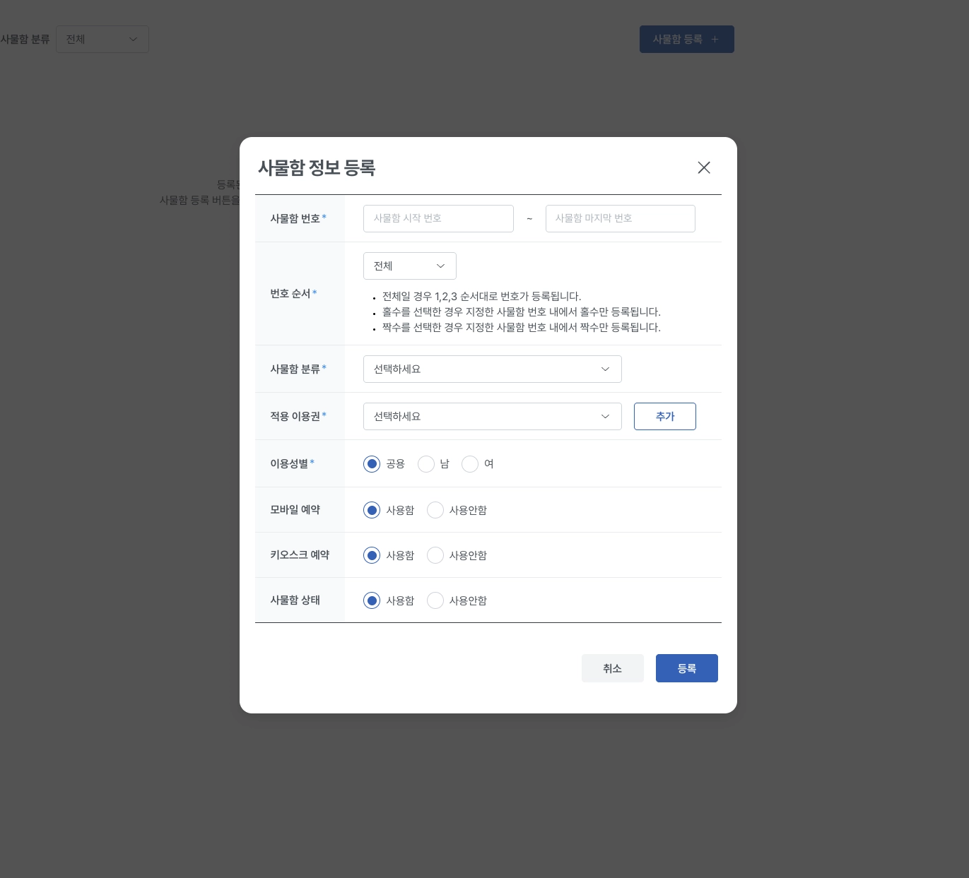 홀수를 선택한 경우 지정한 사물함 번호 내에서 홀수만 등록됩니다.