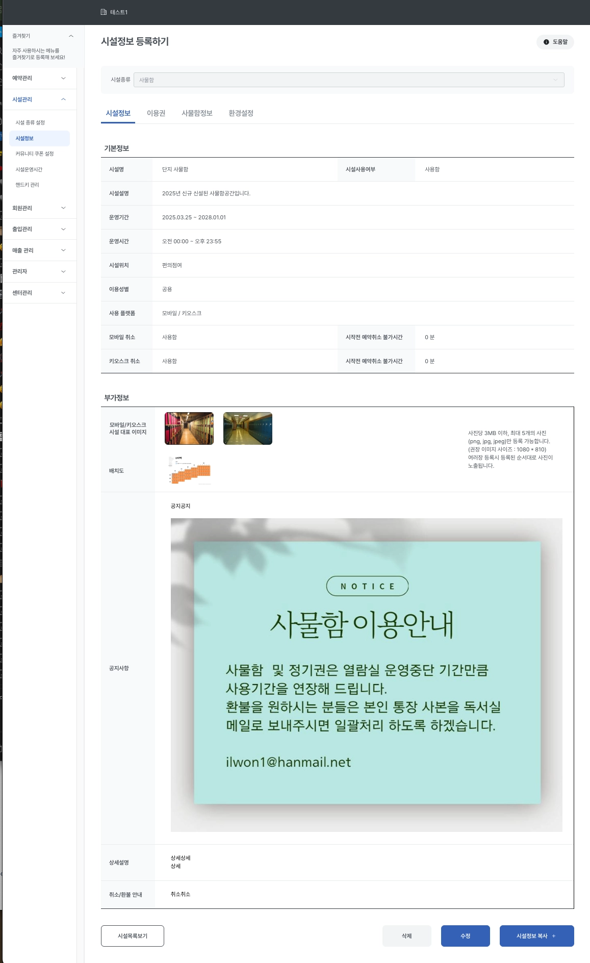 시설종류로 사물함 선택시 해당 시설에 입력해야하는 템플릿이 표시됩니다.