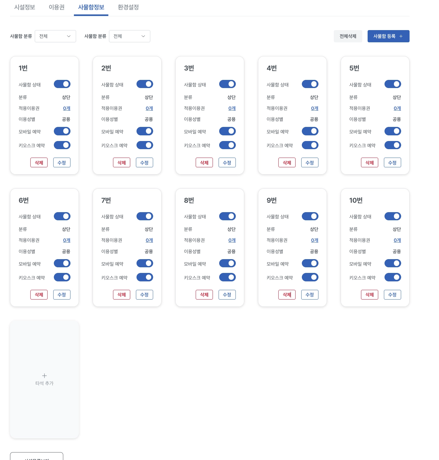 사물함별 좌석상태, 모바일예약, 키오스크 예약 등의 변경이 가능하며 선택한 좌석의 예약이 없을 경우 개별삭제, 전체삭제가 가능합니다.