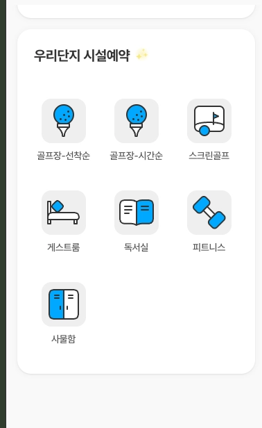 시설종류 순서 설정은 관리자 예약현황의 탭 순서에 영향을 주며, 모바일의 우리단지 시설예약의 순서에 영향을 줍니다.