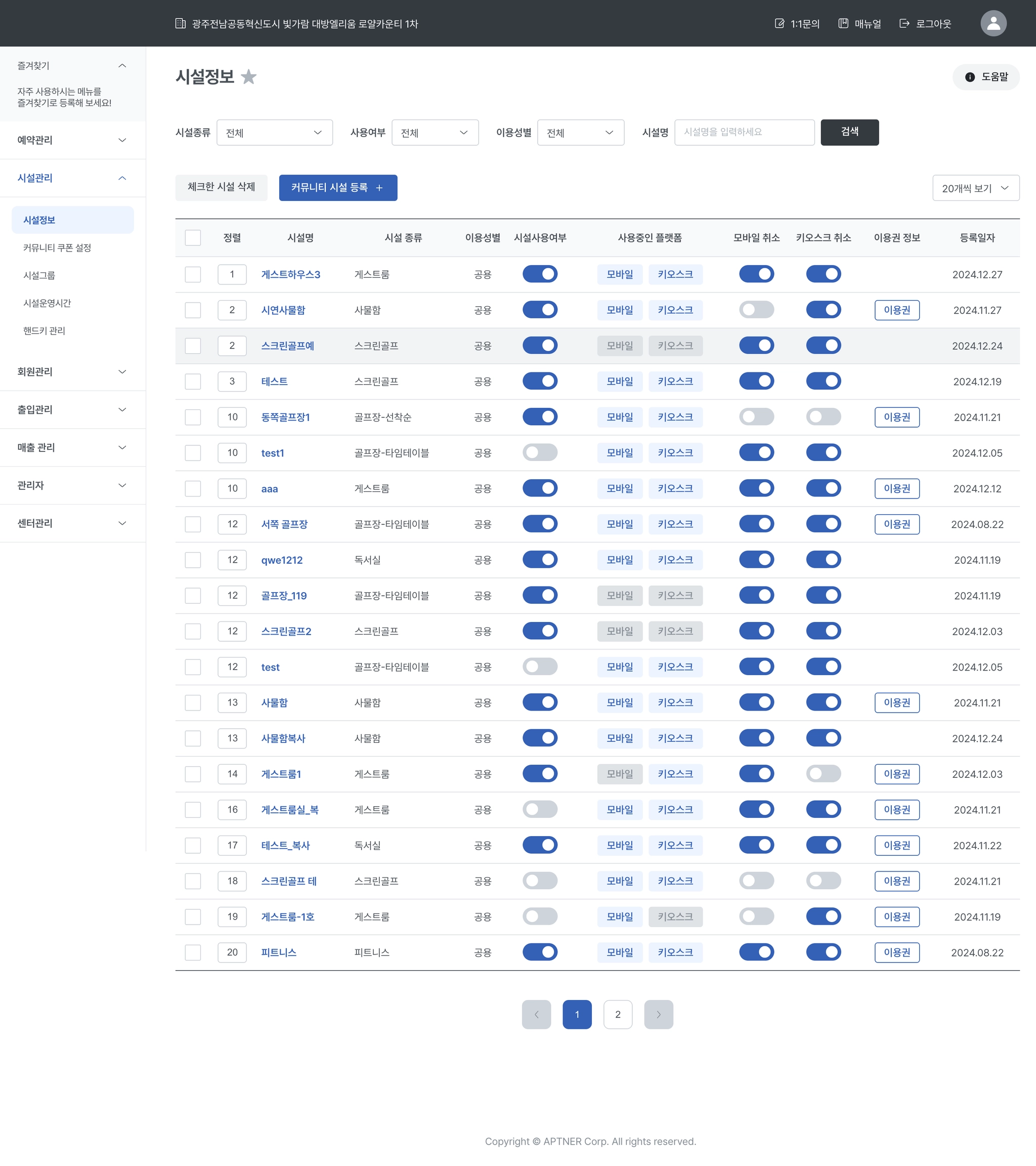 커뮤니티 시설의 사용여부, 사용중인 플랫폼 설정, 모바일/키오스크 취소 등의 기능을 설정할 수 있습니다.