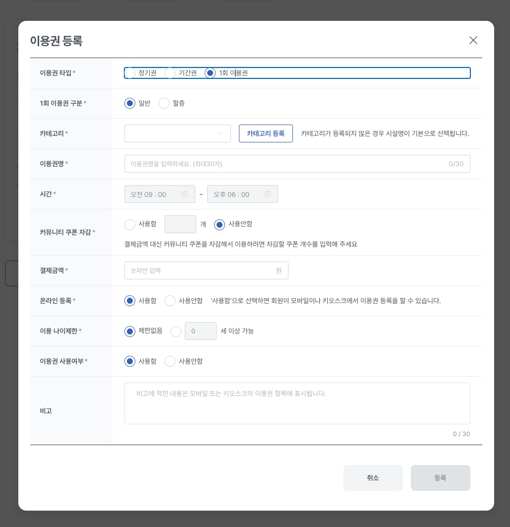 이용권을 커뮤니티 쿠폰을 사용해서 등록하게 하고 싶은 경우 차감할 커뮤니티 쿠폰 개수를 입력해 주세요. 회원이 이용권 결제시 보유한 커뮤니티 쿠폰에서 이용권의 커뮤니티 쿠폰 개수만큼 차감됩니다.