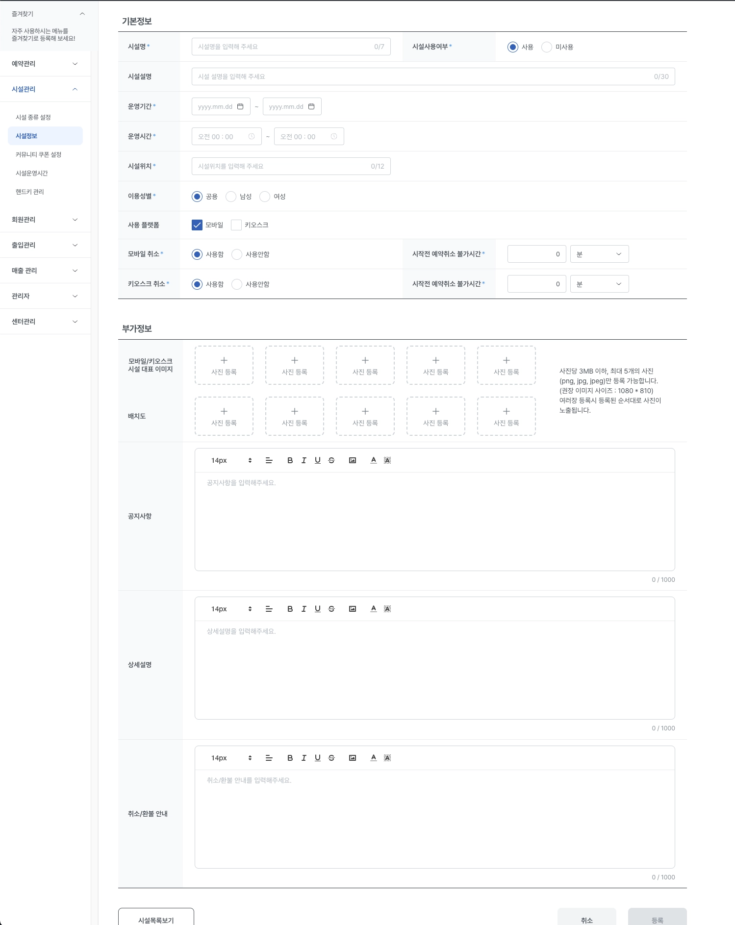 시설종류에서 등록할 시설 선택시 해당 시설 등록 템플릿이 표시됩니다.