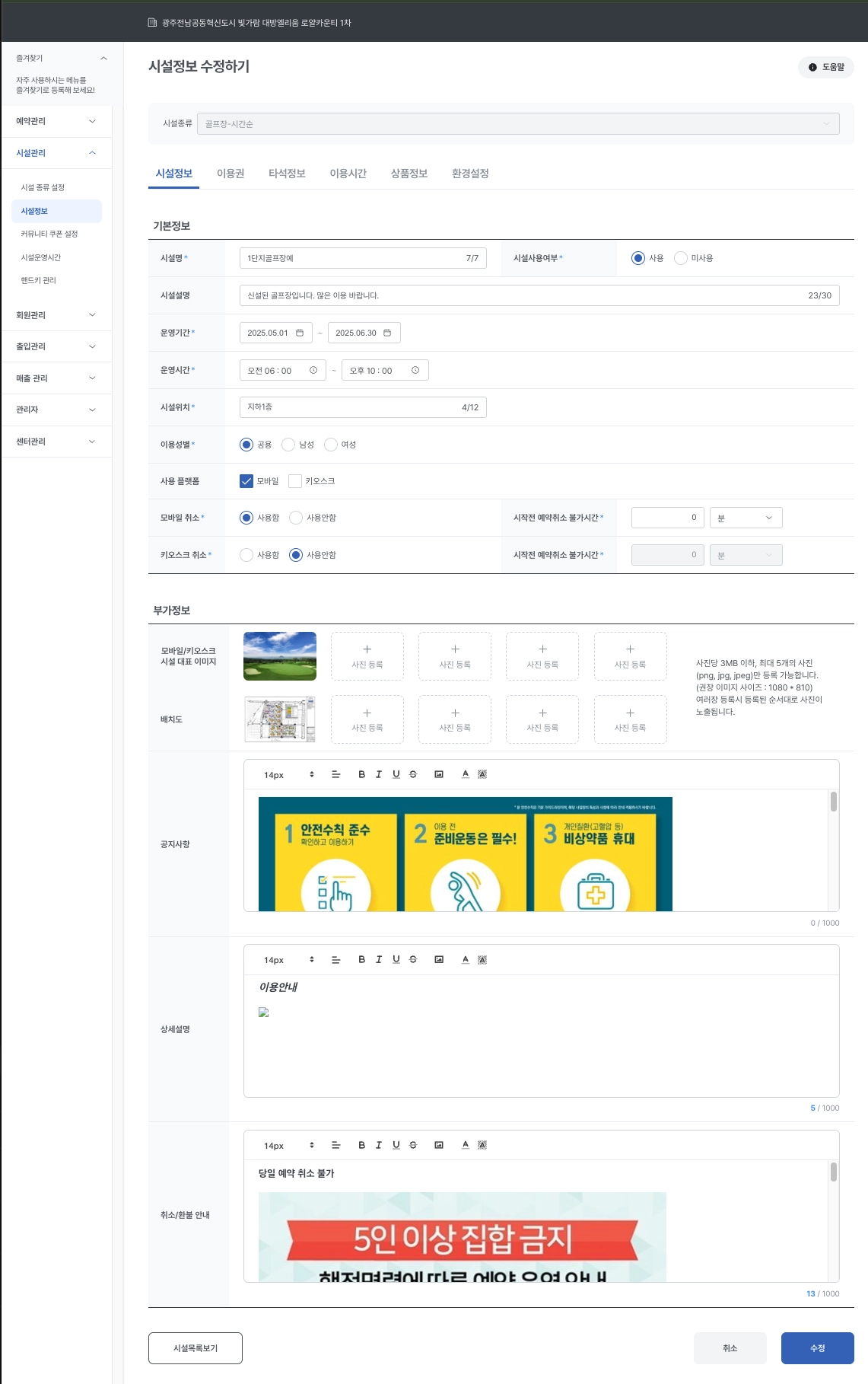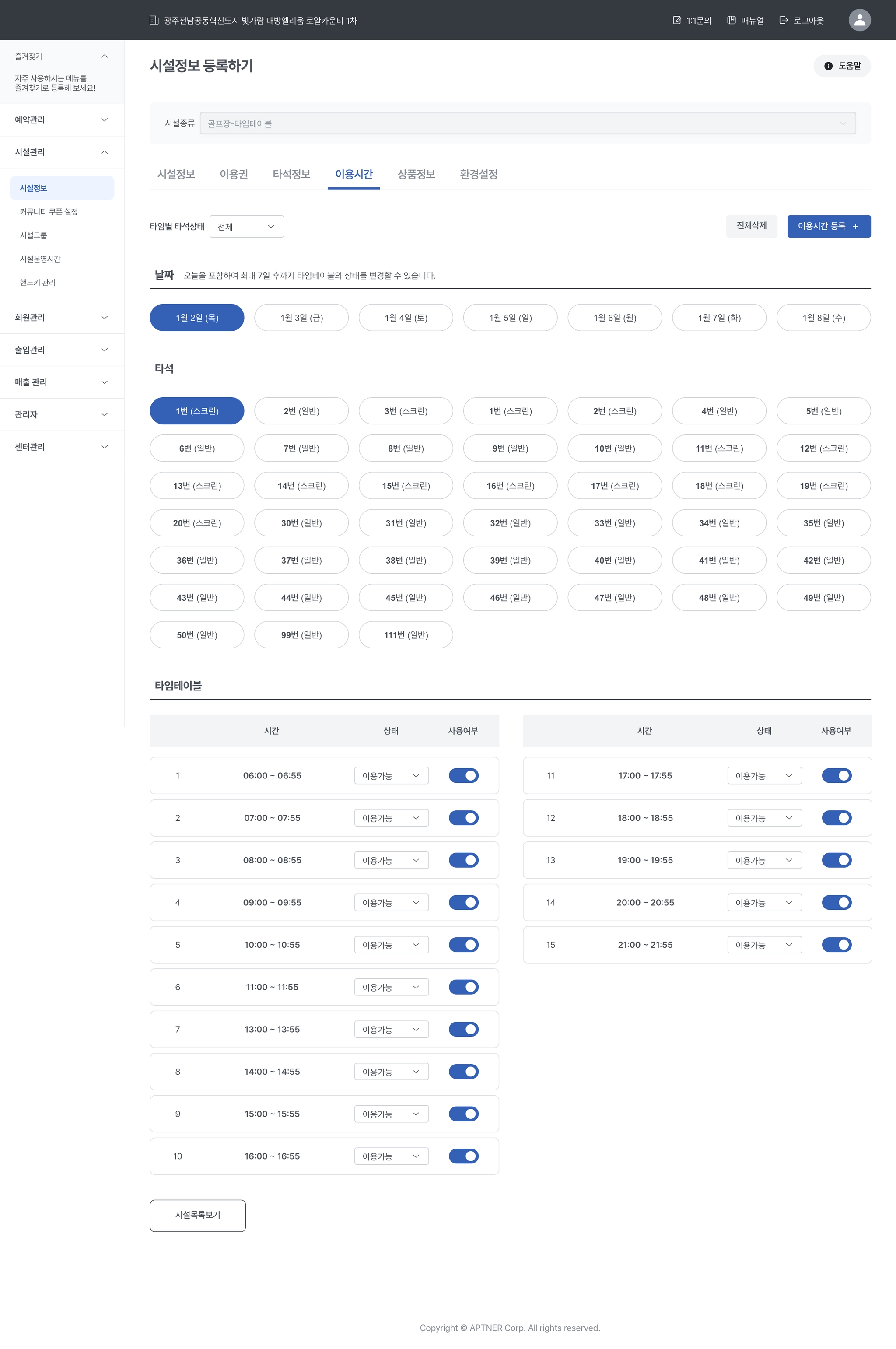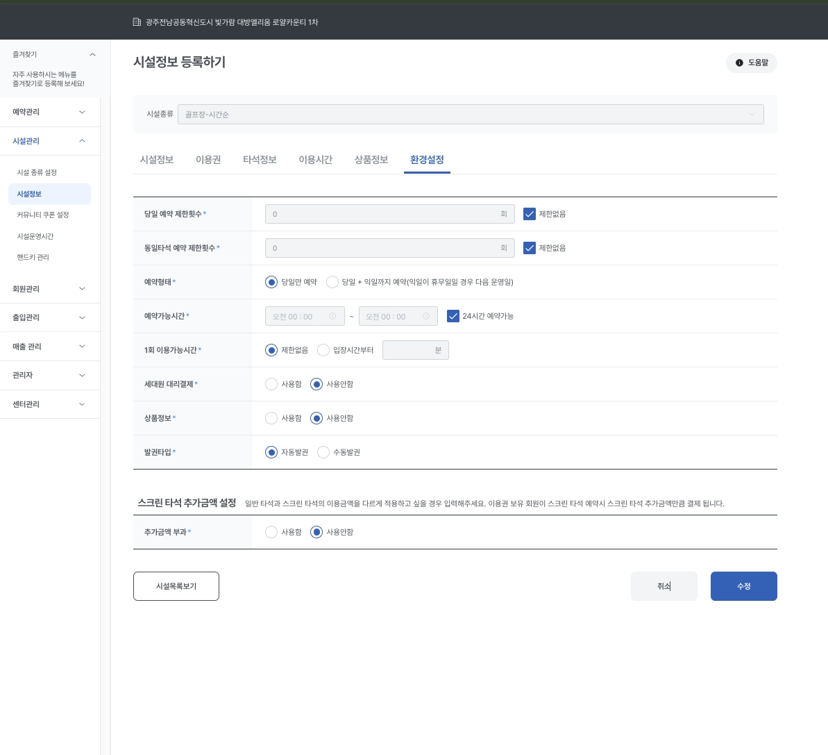 골프장-시간순 시설의 경우 이용시간을 등록해야 합니다.