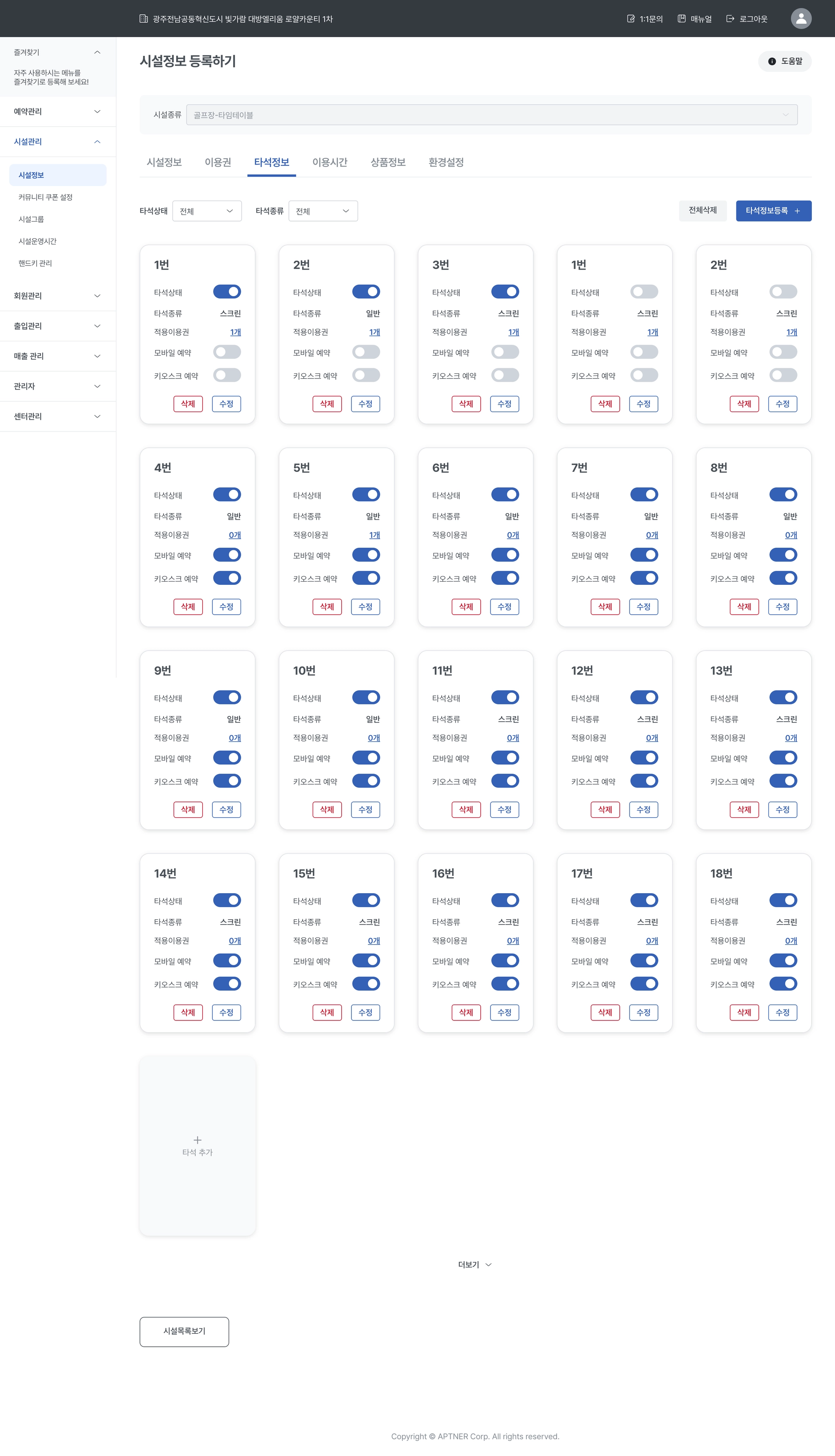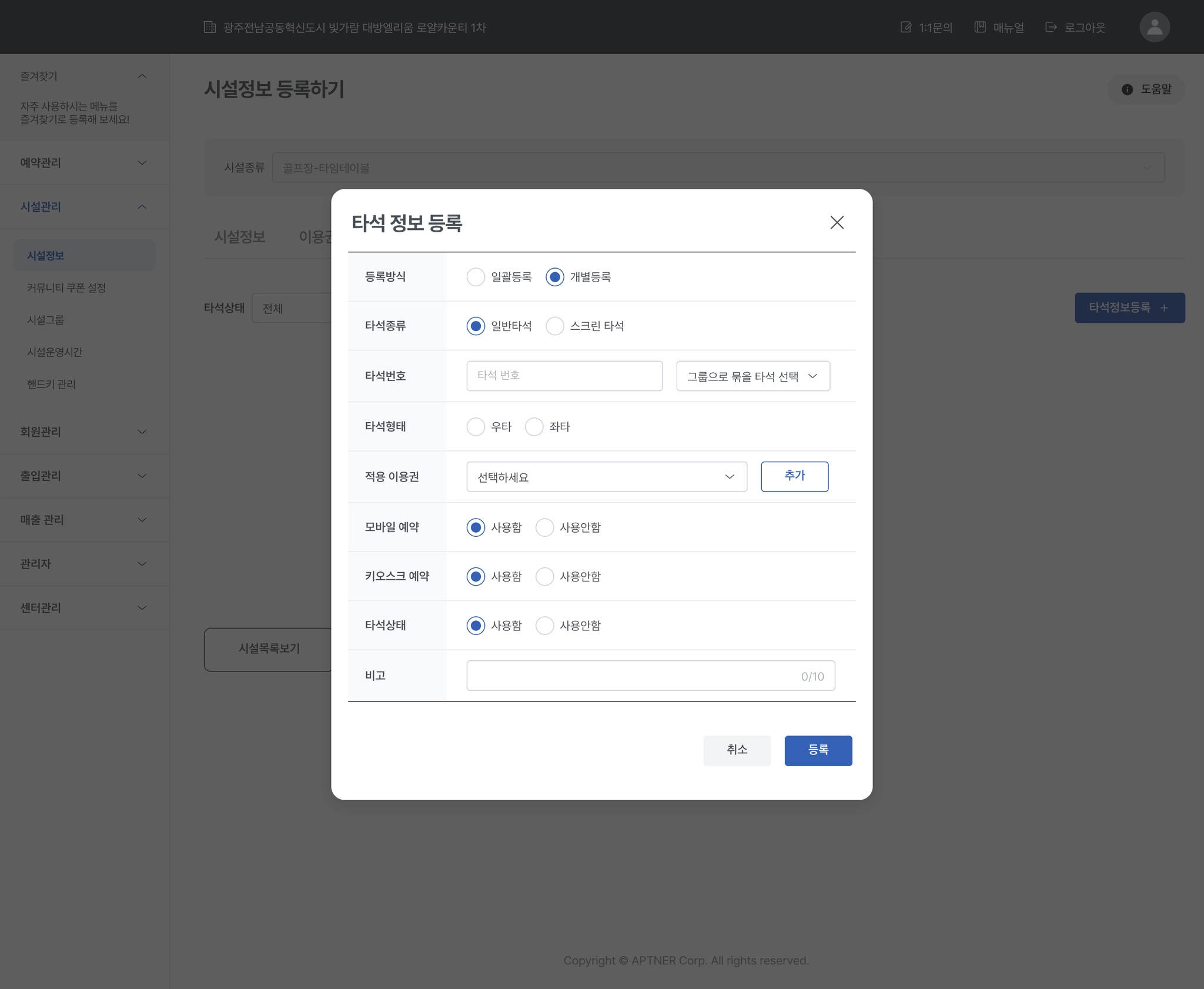 일반타석과 스크린타석이 나누어진 경우 개별로 입력해서 생성할 수 있습니다.