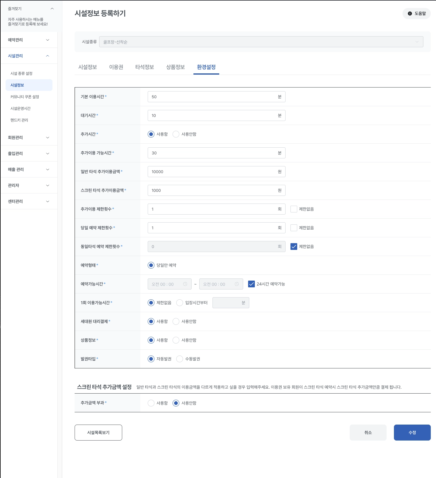 일반타석과 스크린타석의 이용금액을 다르게 받고 싶은 경우 ‘스크린타석 예약시 추가금액’을 등록하면 스크린타석은 추가금액을 부과할 수 있습니다.