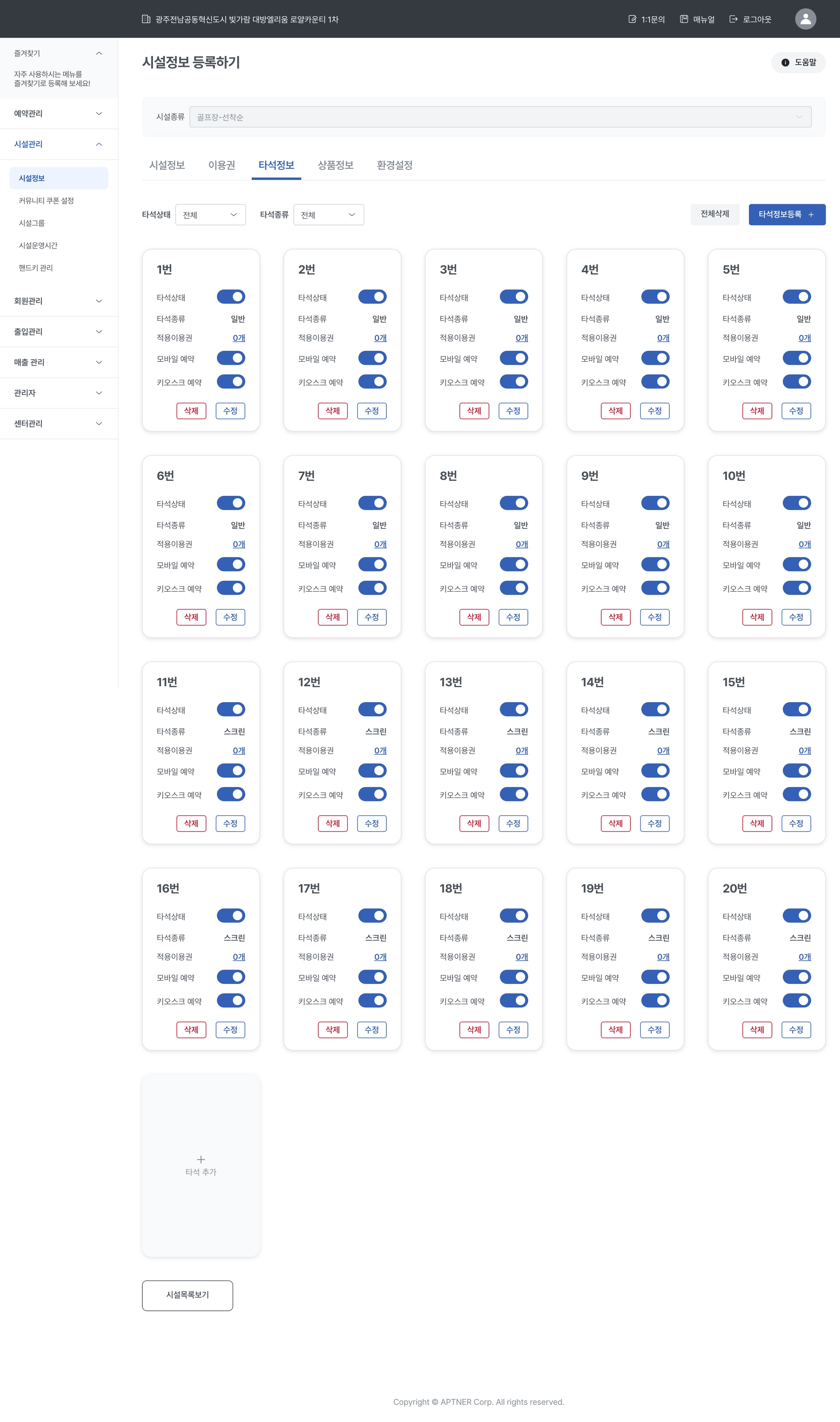 일반타석과 스크린타석이 나누어진 경우 개별로 입력해서 생성할 수 있습니다.