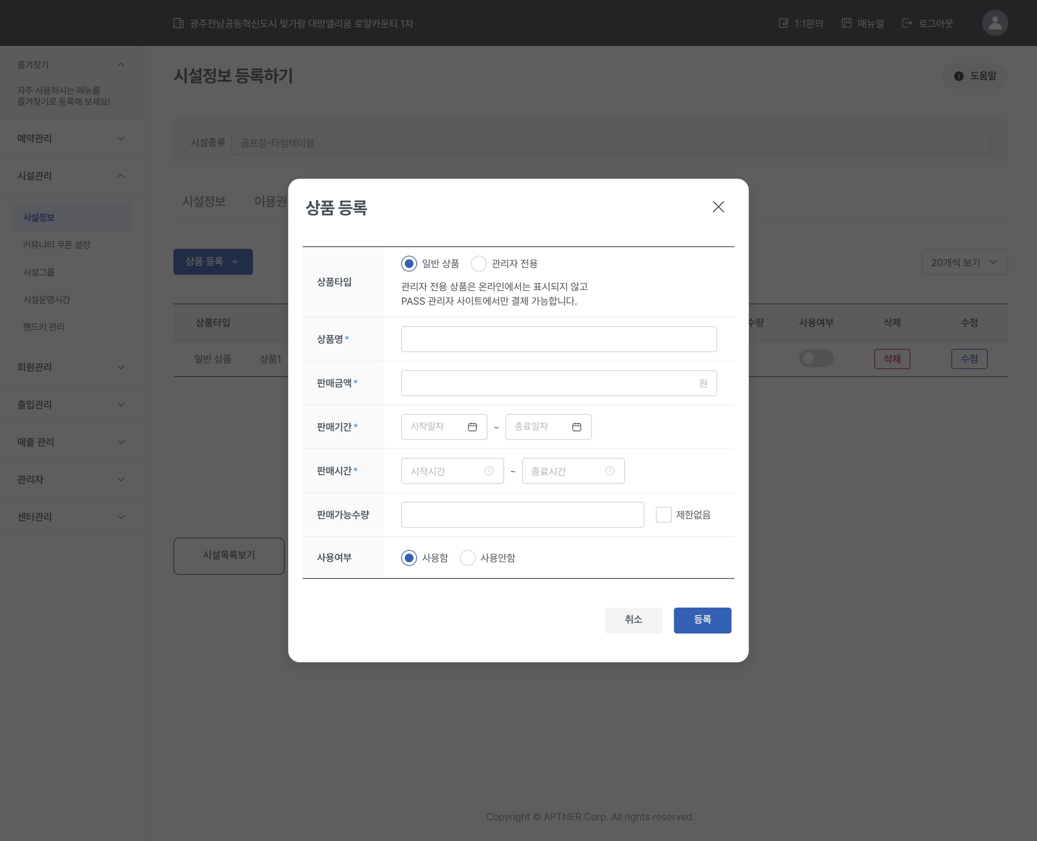 판매기간의 시작일을 설정할 수 있으며, 종료일을 시설 운영기간의 종료일로 설정됩니다.