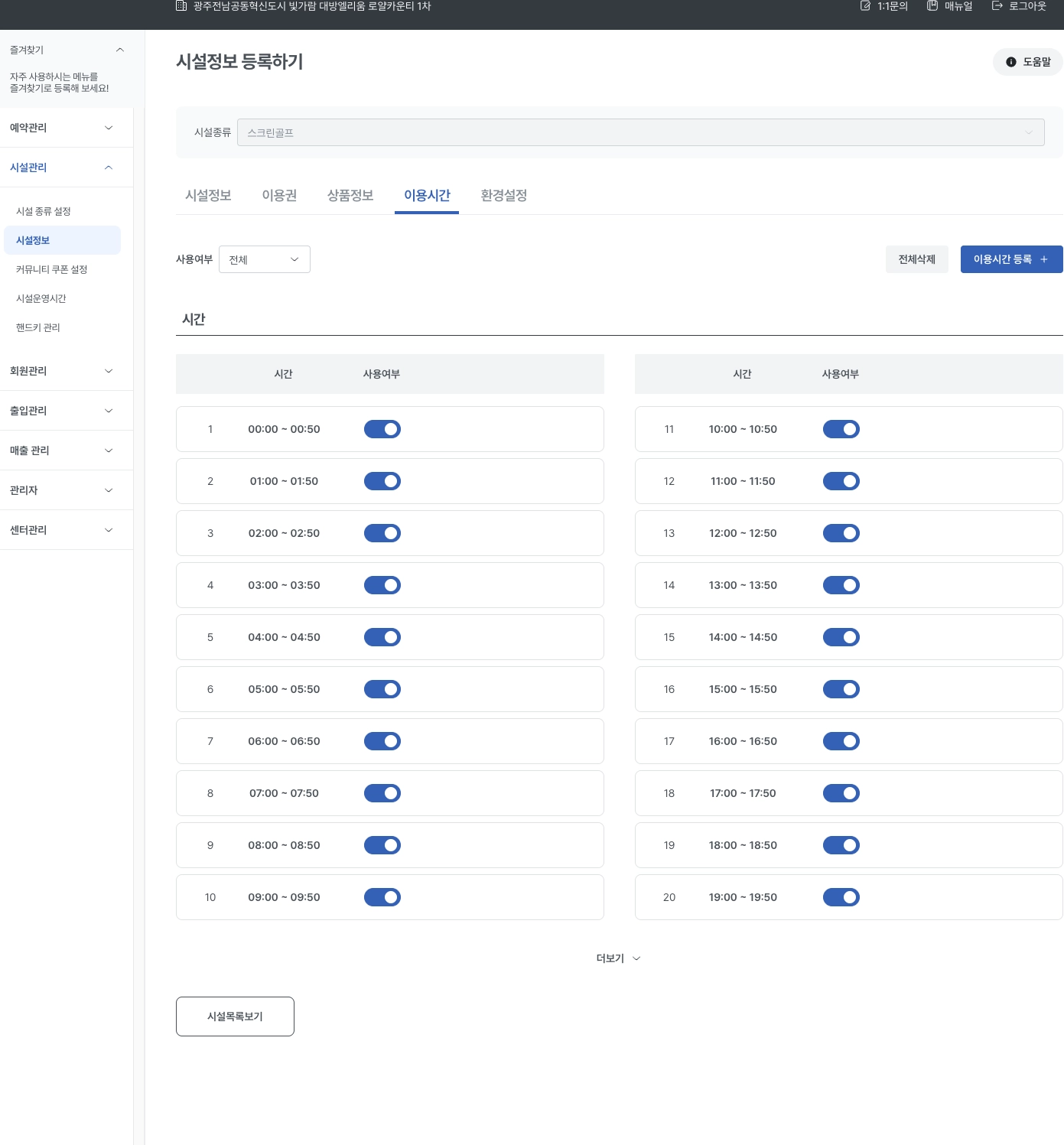 골프장-시간순 시설의 경우 이용시간을 등록해야 합니다.