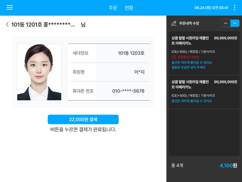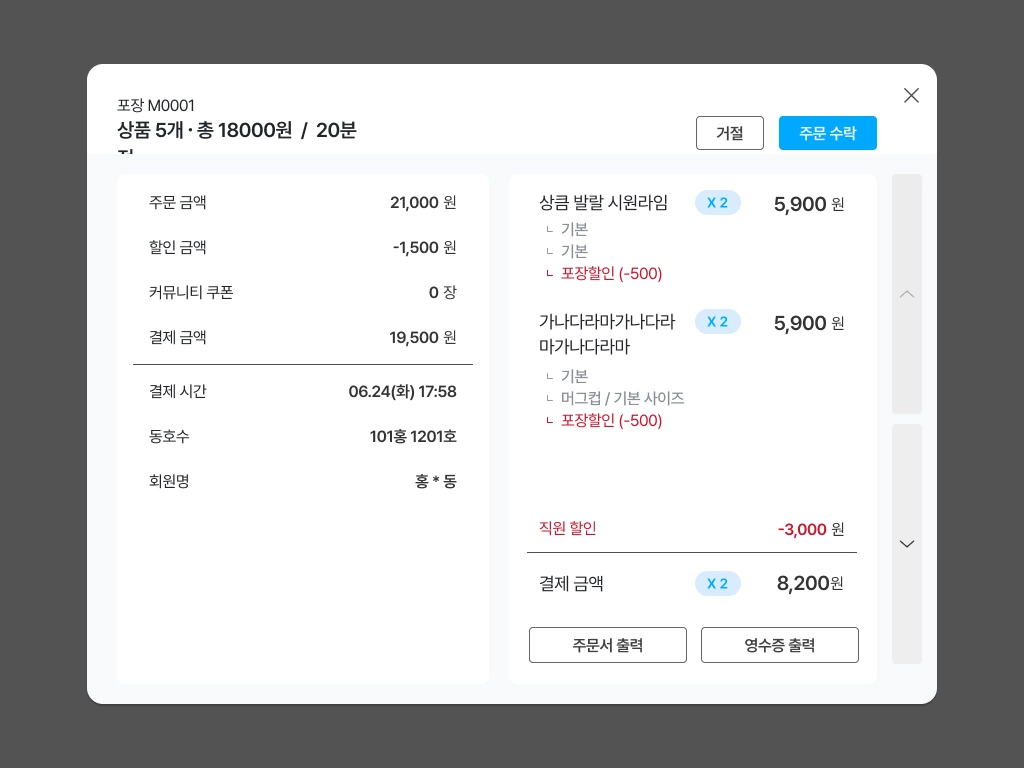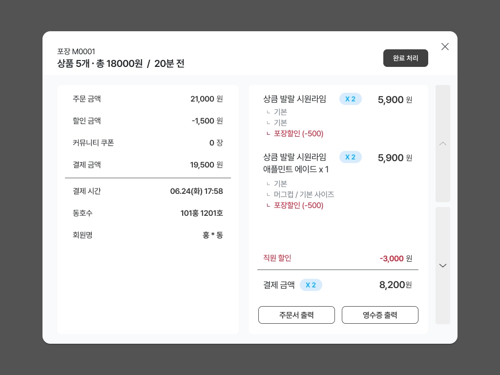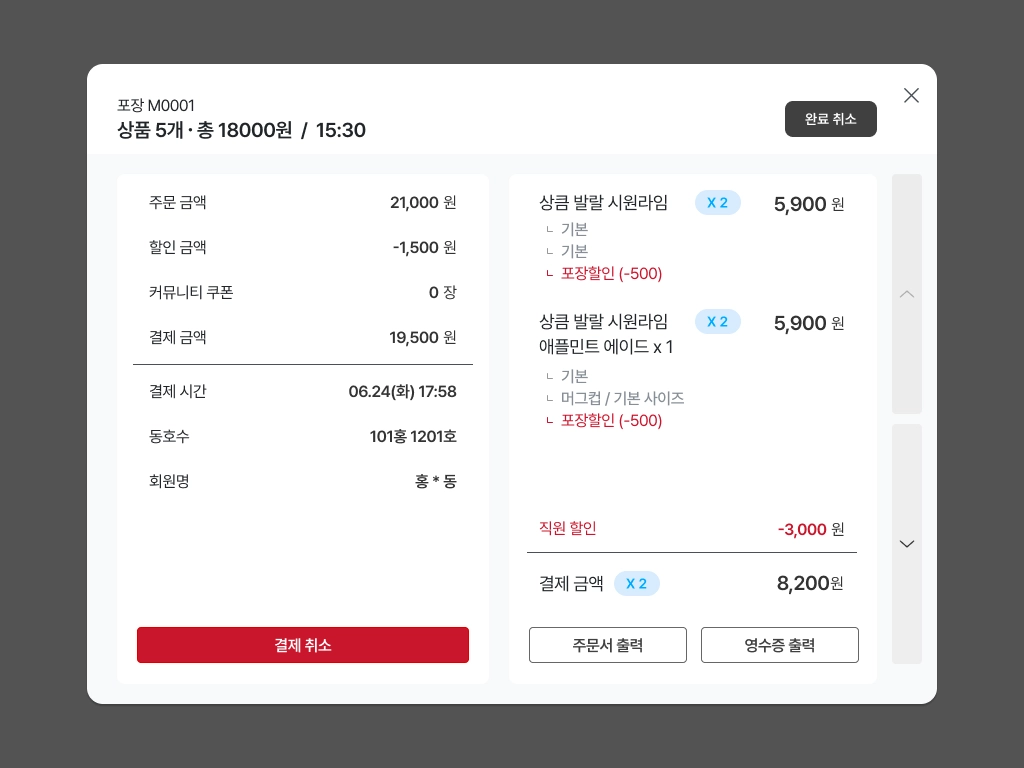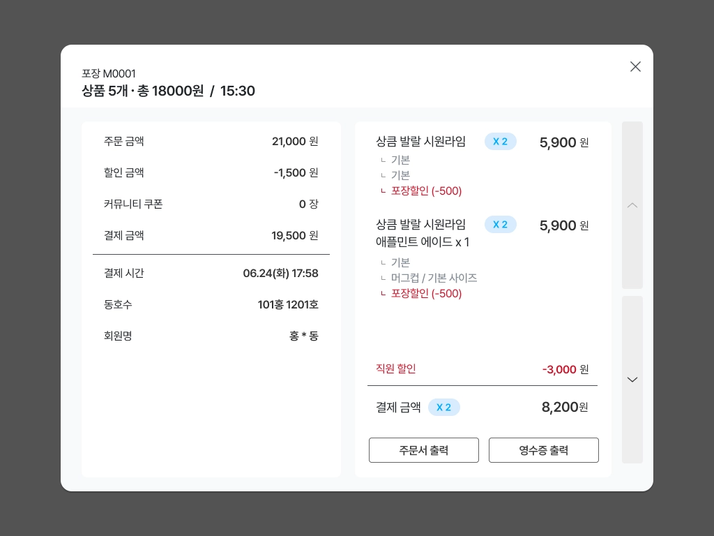 주문 정보, 할인 내역, 결제 금액 및 시간, 회원명 등 세부 정보를 확인할 수 있습니다.