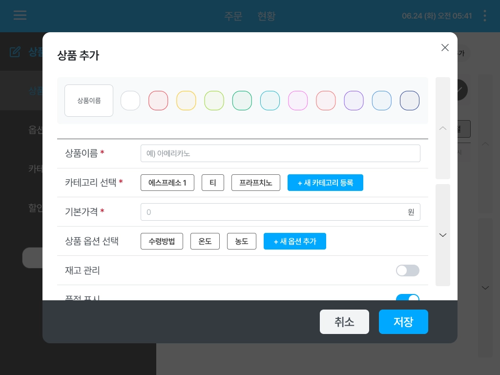 상품 색상 설정 : 팝업 상단에 여러 개의 색상 칩이 표시됩니다. 여기서 포스(POS) 주문 화면에 표시할 색상을 선택합니다.