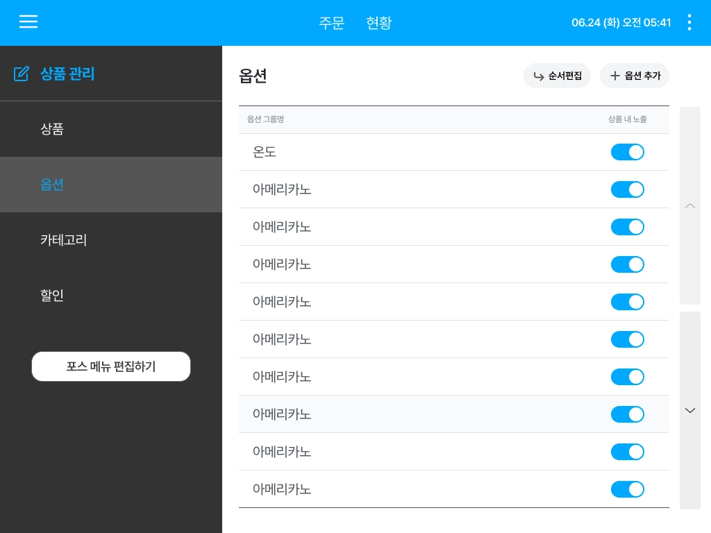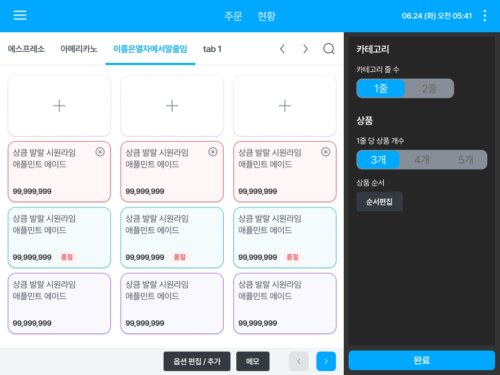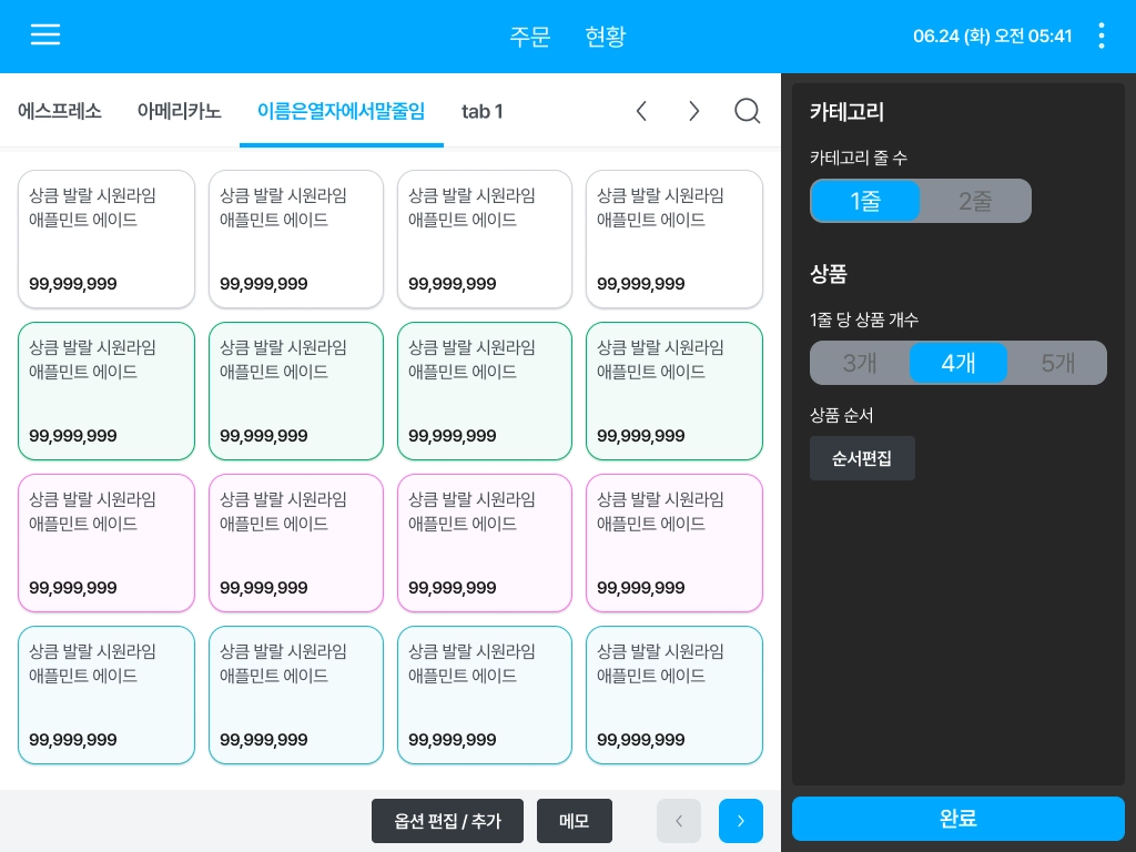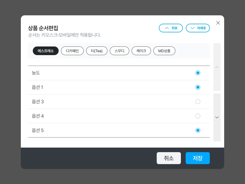 순서가 위로 올라갈수록 포스, 모바일, 키오스크 주문 화면에서 상단에 표시됩니다.