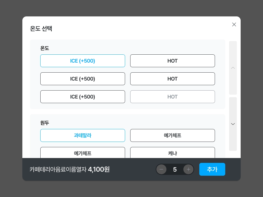 옵션 그룹 내에서 선택 가능한 항목명을 입력합니다. (예: 차가운 음료, 따뜻한 음료)