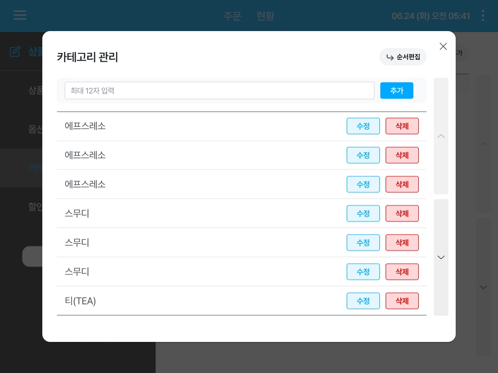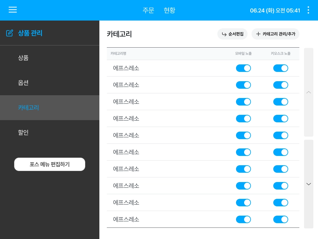 순서 변경은 키오스크·모바일 화면에만 적용됩니다.