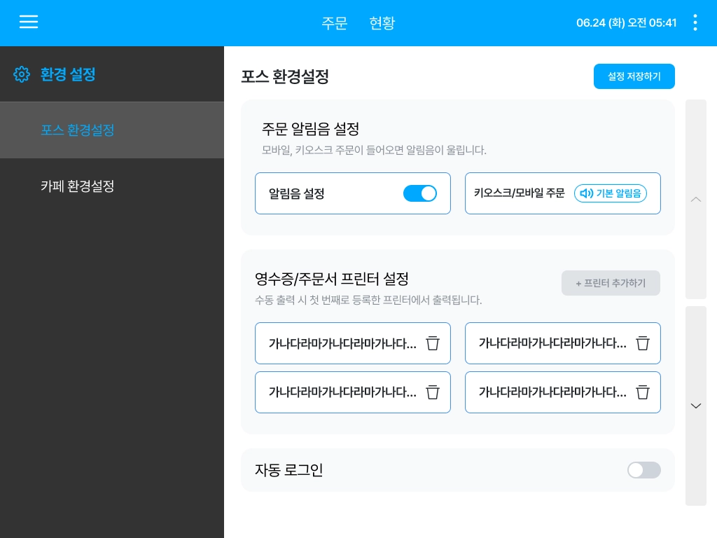 [포스 환경설정] : 주문 알림음, 프린터, 자동 로그인 설정이 가능합니다.