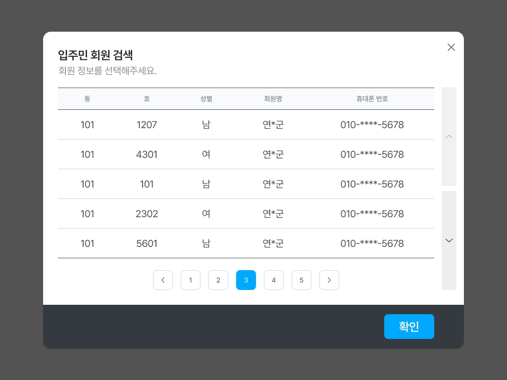 주문자 정보를 입력 후 [확인] 버튼을 클릭하면 주문자 검색 모달이 노출되며 해당 주문자가 맞는 지 확인 후 해당 정보가 필터에 적용됩니다.