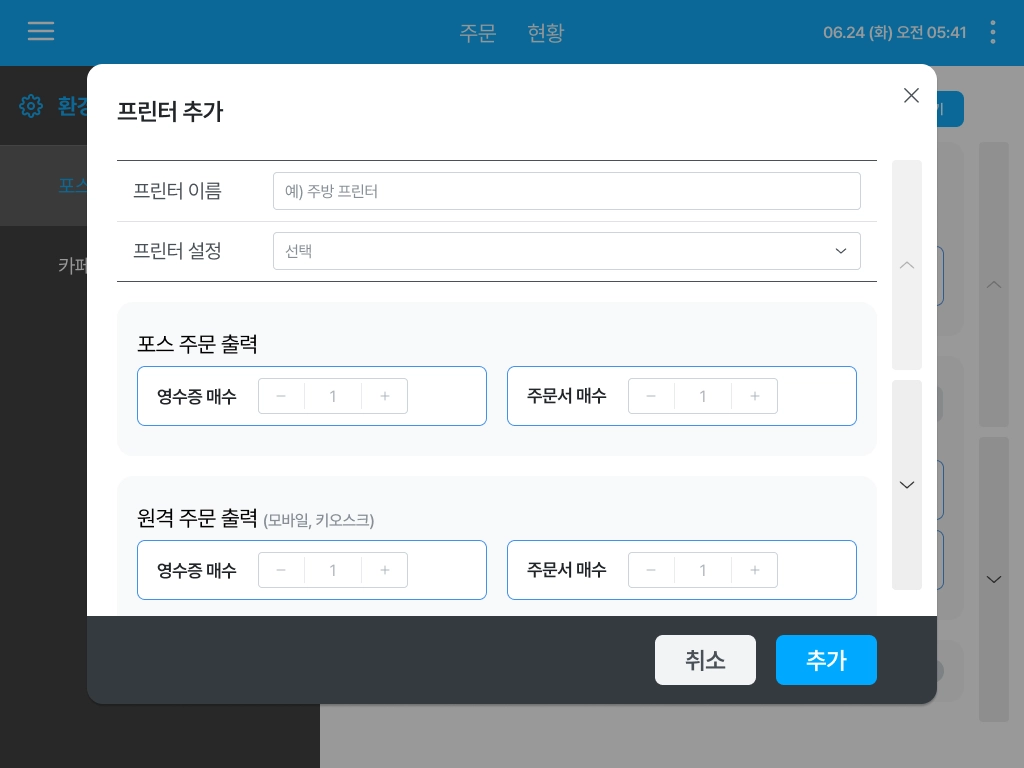 영수증 및 주문서를 출력할 프린터를 설정할 수 있습니다.