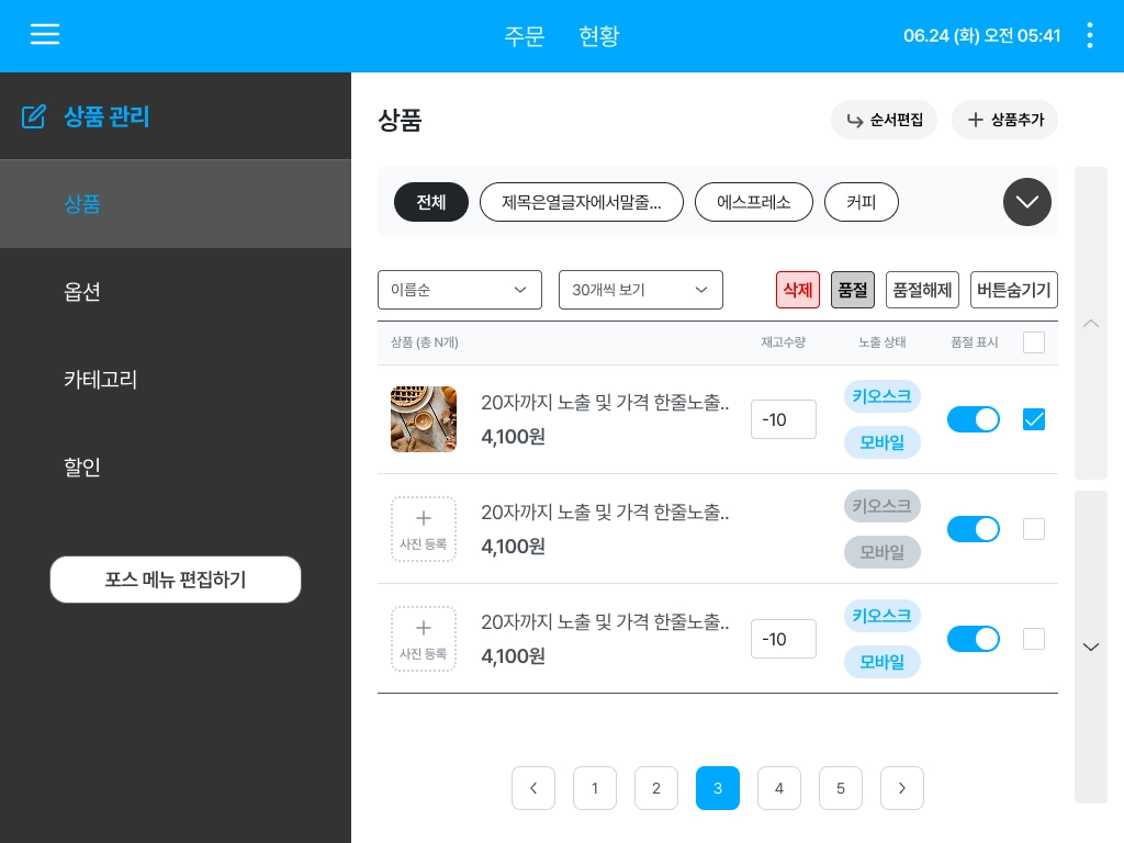 품절 표시: 품절 여부를 설정합니다. 품절 시 모바일/키오스크에서는 주문 불가하나, 관리자는 포스에서 판매할 수 있습니다.