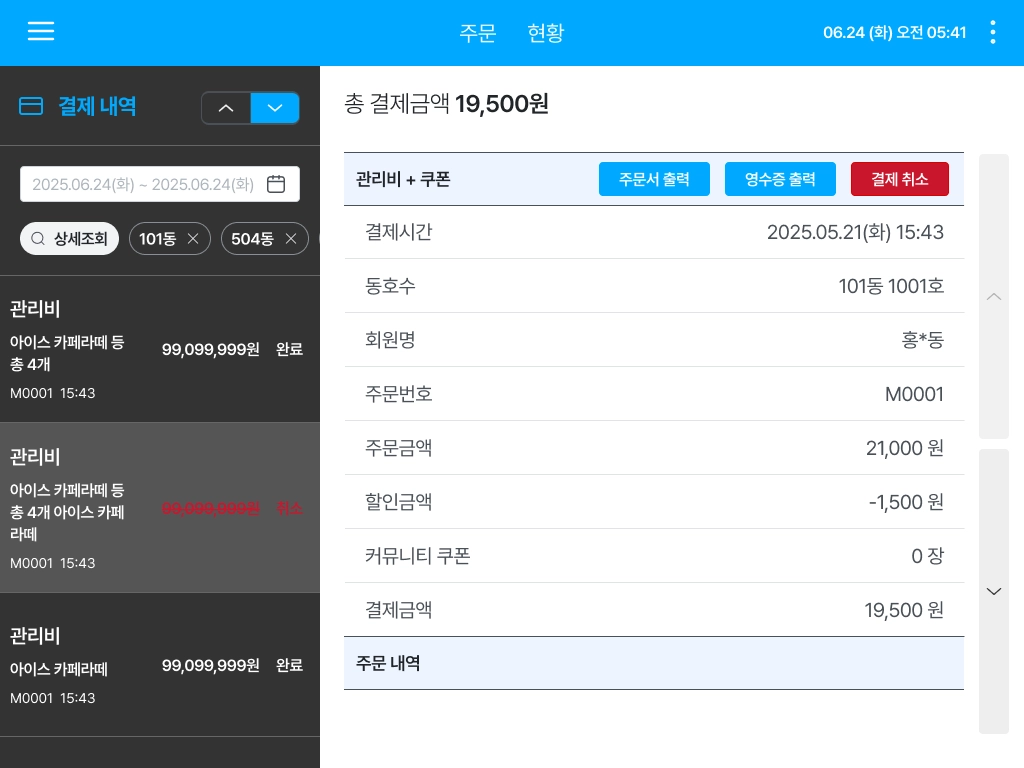 결제내역 메뉴에서는 최근 결제된 주문 목록을 확인할 수 있습니다.