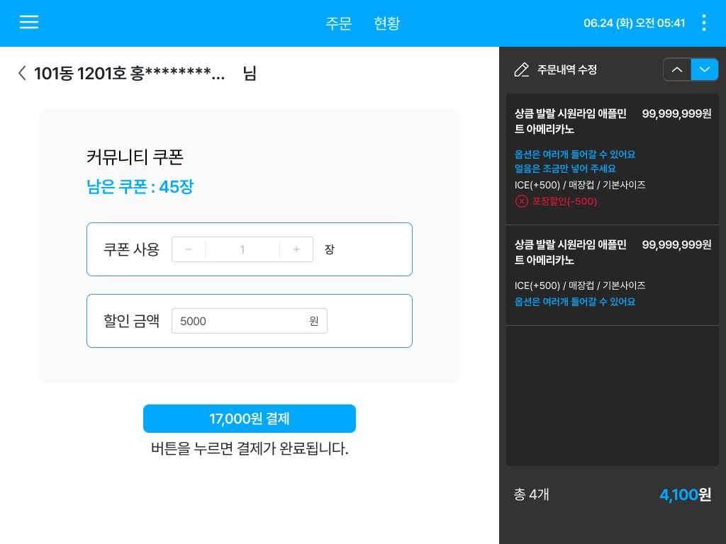 모바일과 키오스크 노출을 끄면, 해당 카테고리는 모바일과 키오스크에서 노출되지 않아 입주민 회원이 주문할 수 없습니다.