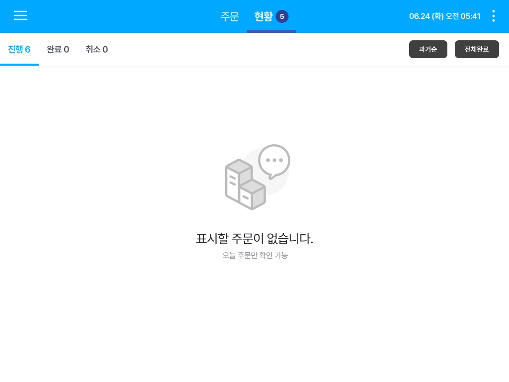 [주문 현황] : 당일 주문 내역을 확인할 수 있는 화면입니다. (메인 화면 상단 [현황] 버튼과 동일)