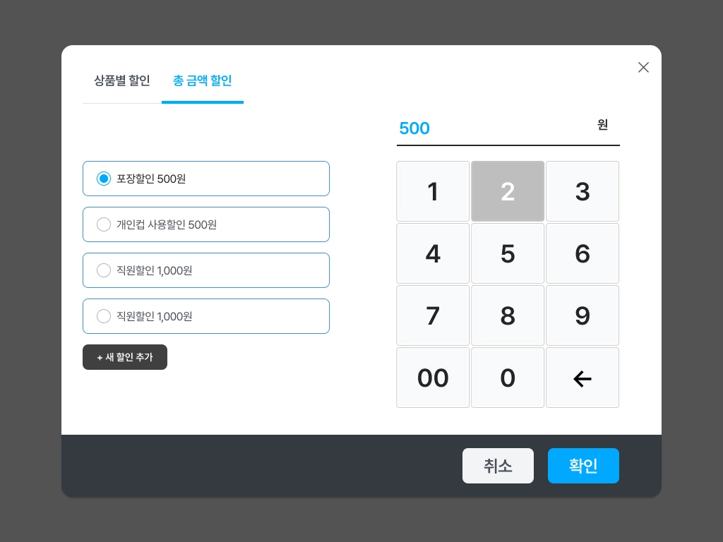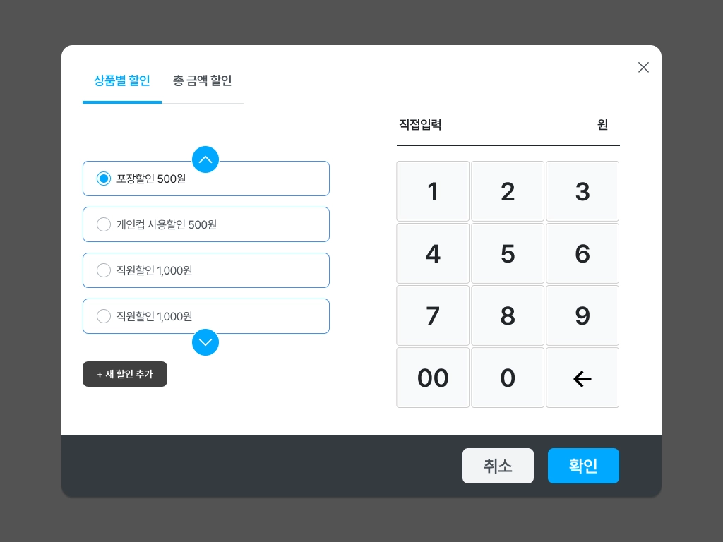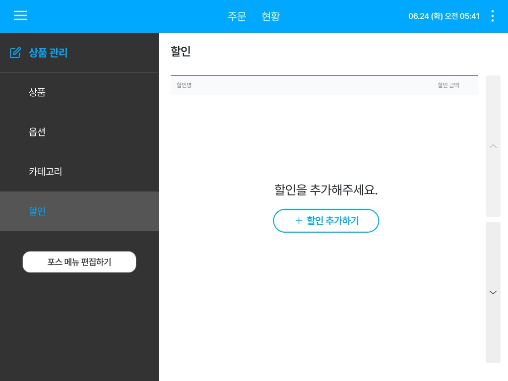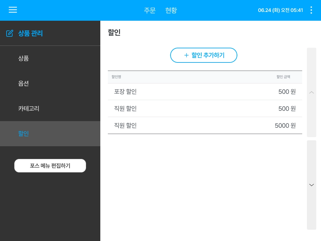 하위 메뉴: 카테고리, 상품, 옵션, 할인