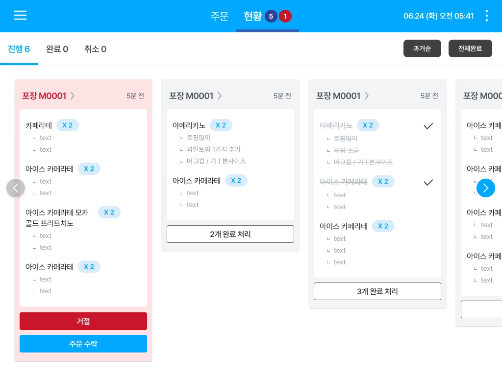 진행 중인 주문의 경우 [완료 처리] 버튼을 클릭하여 주문을 완료할 수 있습니다.