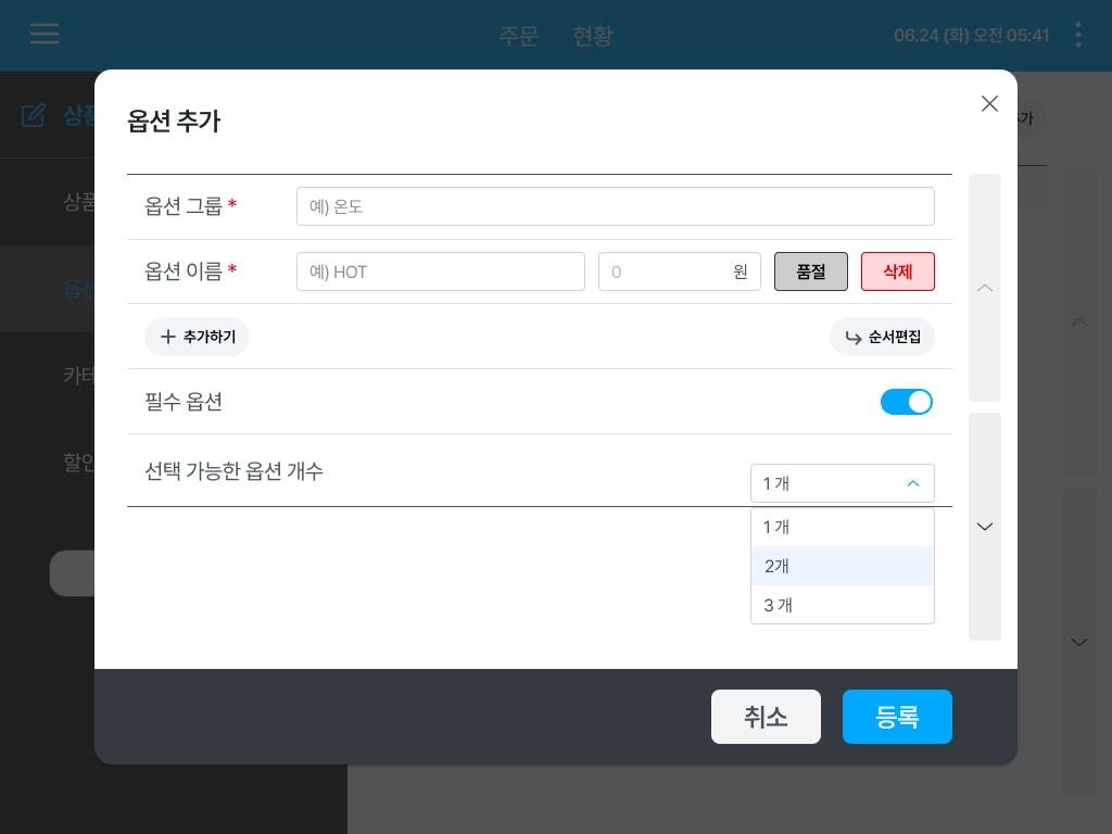 선택 가능 개수: 한 옵션 그룹 내에서 선택할 수 있는 최대 항목 수를 설정합니다.