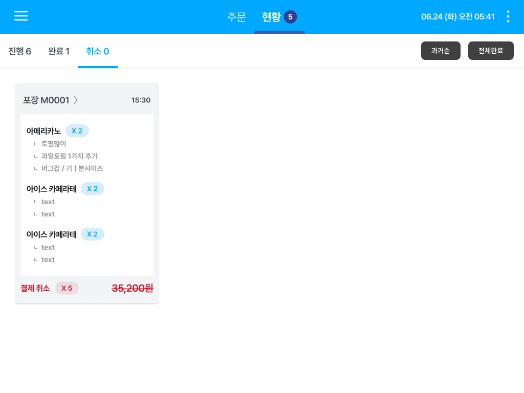 [완료 취소] 버튼을 클릭하면 완료된 주문건이 진행중으로 변경됩니다. 이때, 카페 설정에 따라 주문자에게 푸시 알림이 전송됩니다.