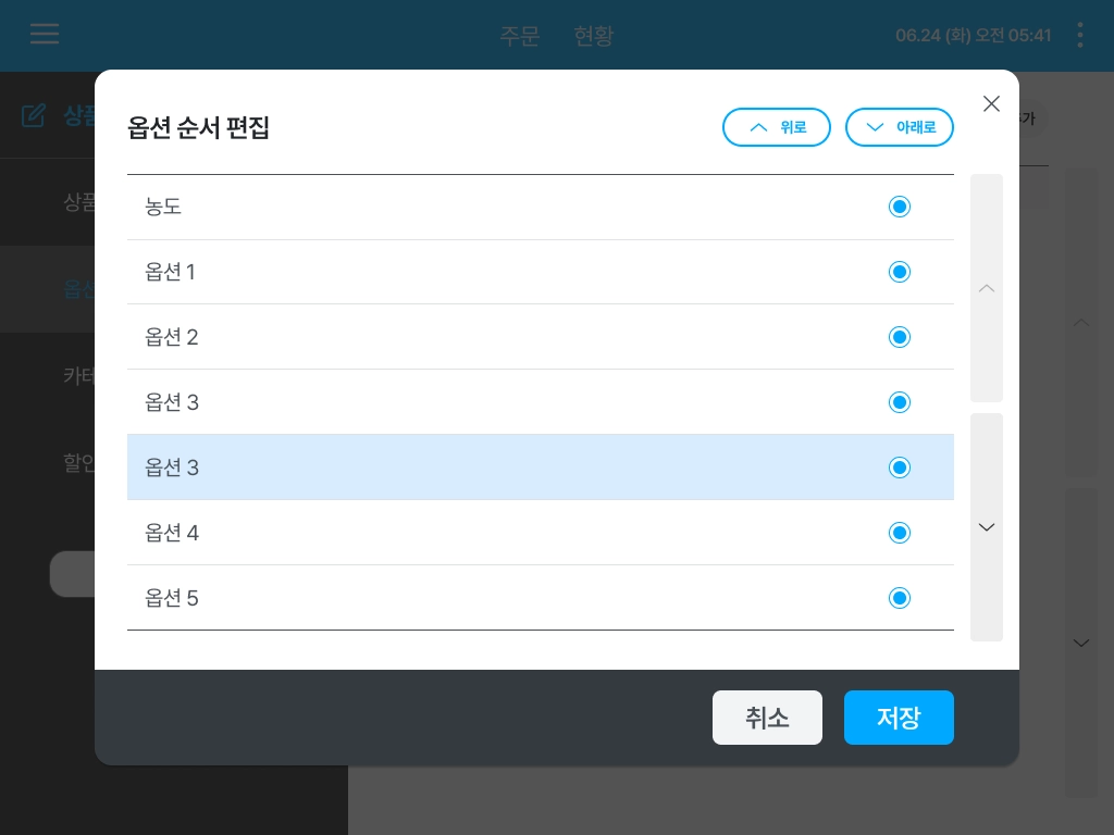 원하는 ‘옵션 이름’을 선택한 뒤 [위로], [아래로] 버튼으로 순서를 변경할 수 있으며, 위에 위치할수록 주문 화면에서 먼저 노출됩니다.