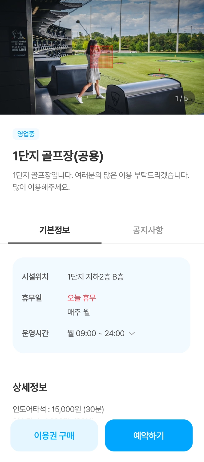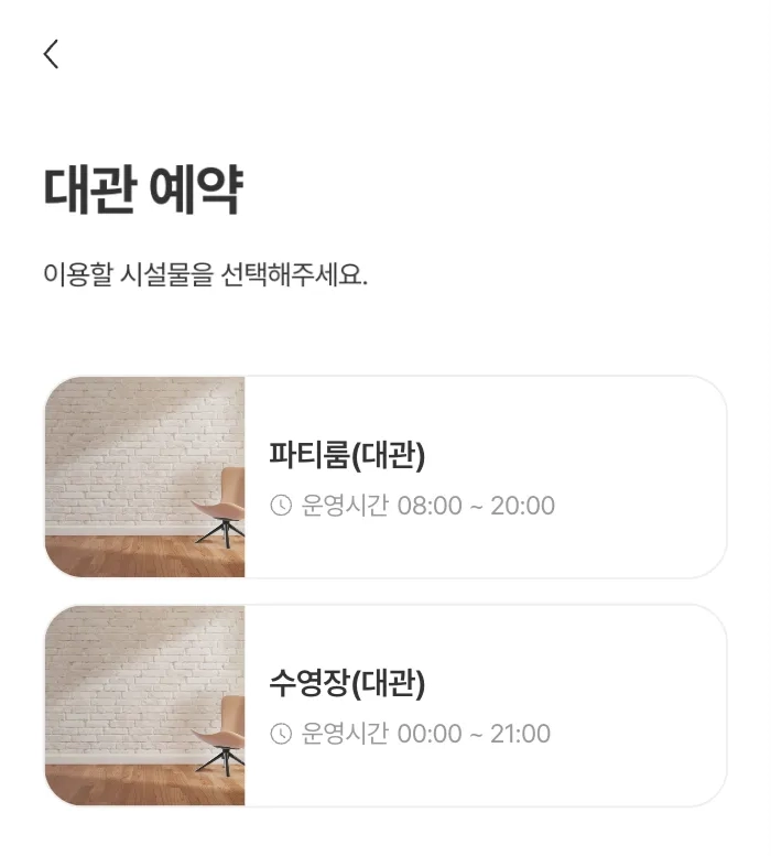 아파트 단지에서 사용가능한 시설을 확인하고 예약을 할 수 있습니다.