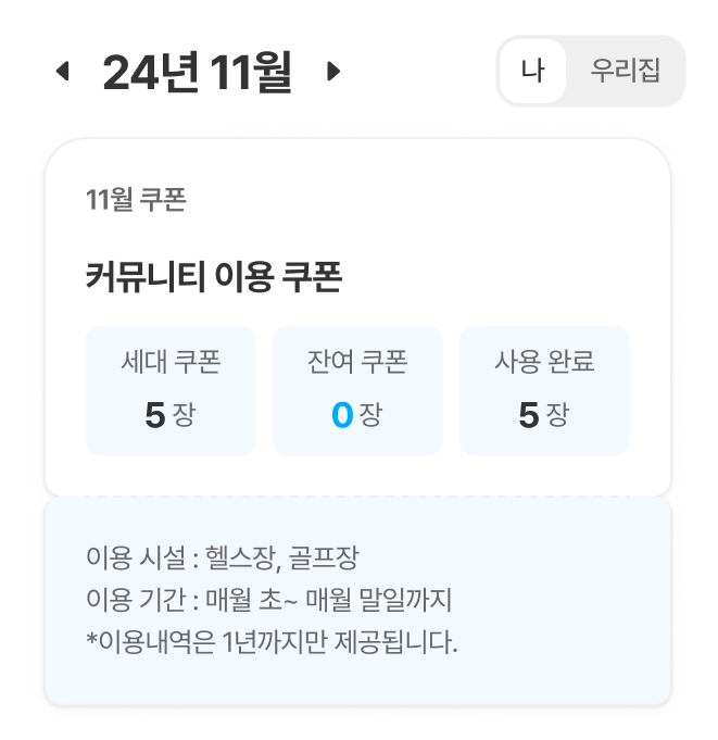 월 기준으로 세대별 지급된 커뮤니티 쿠폰의 총 개수, 사용 가능한 잔여 쿠폰, 사용 완료된 쿠폰을 확인할 수 있습니다.